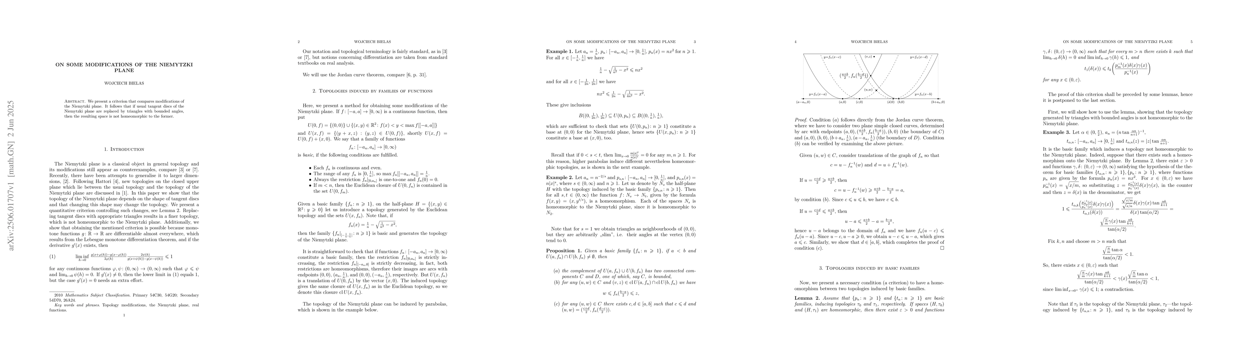Researchers developed a criterion to distinguish between modifications of the Niemytzki plane with triangles versus usual tangent discs, finding that the triangle modification creates a space not homeomorphic to the original.