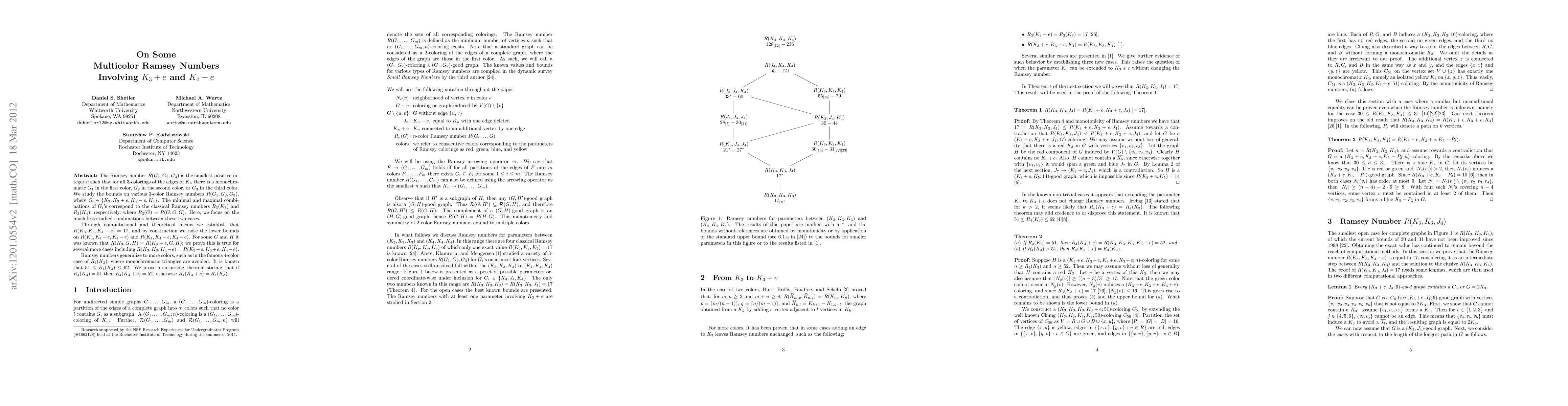 The Ramsey number $R(G_1, G_2, G_3)$ is the smallest positive integer $n$ such that for all 3-colorings of the edges of $K_n$ there is a monochromatic $G_1$ in the first color, $G_2$ in the second color, or $G_3$ in the third color. We study the bounds on various 3-color Ramsey numbers $R(G_1, G_2, G_3)$, where $G_i \in \{K_3, K_3+e, K_4-e, K_4\}$. The minimal and maximal combinations of $G_i$'s correspond to the classical Ramsey numbers $R_3(K_3)$ and $R_3(K_4)$, respectively, where $R_3(G) = R(G, G, G)$. Here, we focus on the much less studied combinations between these two cases. Through computational and theoretical means we establish that $R(K_3, K_3, K_4-e)=17$, and by construction we raise the lower bounds on $R(K_3, K_4-e, K_4-e)$ and $R(K_4, K_4-e, K_4-e)$. For some $G$ and $H$ it was known that $R(K_3, G, H)=R(K_3+e, G, H)$; we prove this is true for several more cases including $R(K_3, K_3, K_4-e) = R(K_3+e, K_3+e, K_4-e)$. Ramsey numbers generalize to more colors, such as in the famous 4-color case of $R_4(K_3)$, where monochromatic triangles are avoided. It is known that $51 \leq R_4(K_3) \leq 62$. We prove a surprising theorem stating that if $R_4(K_3)=51$ then $R_4(K_3+e)=52$, otherwise $R_4(K_3+e)=R_4(K_3)$.