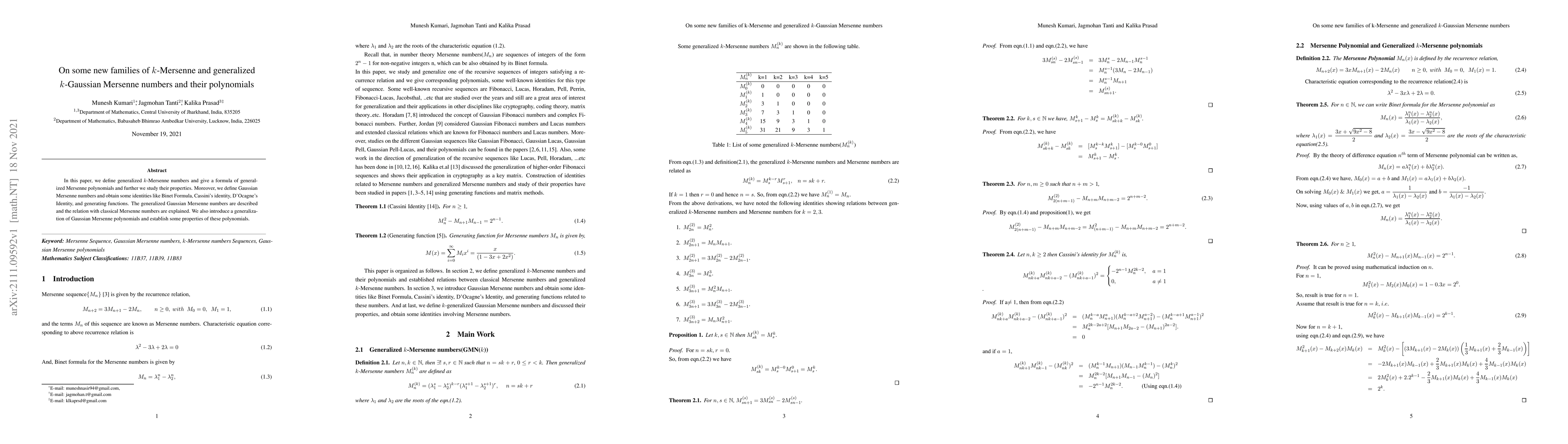 This paper introduces new generalized k-Mersenne numbers and defines generalized Mersenne polynomials, studying their properties. It also defines Gaussian Mersenne numbers, deriving identities such as Binet Formula and Cassini's identity, and explores the relation between these new numbers and classical Mersenne numbers.