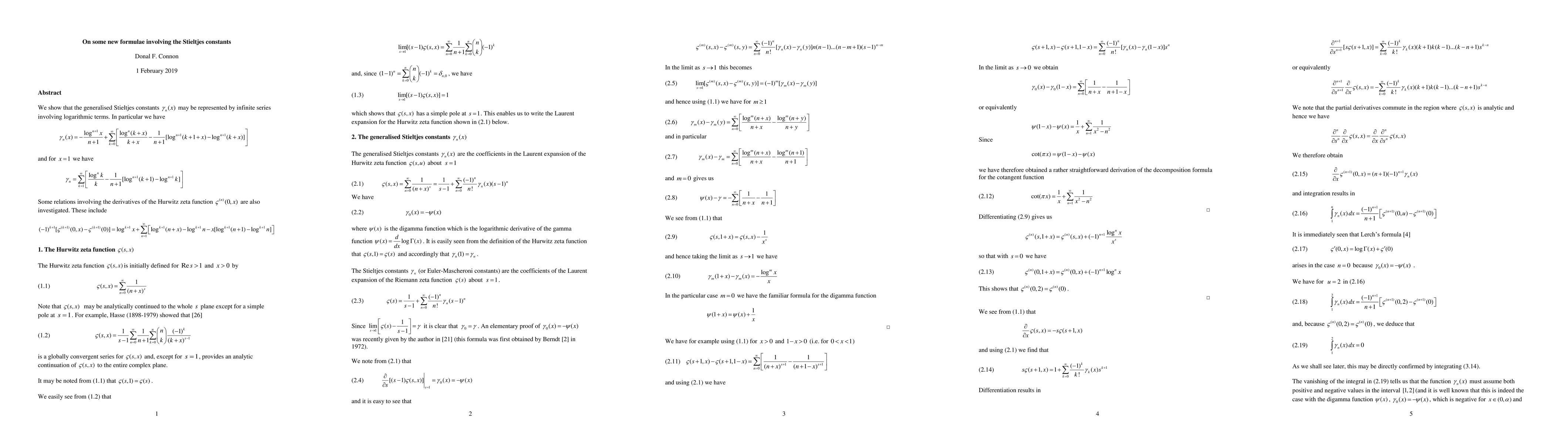 We show that the generalised Stieltjes constants may be represented by infinite series involving logarithmic terms. Some relations involving the derivatives of the Hurwitz zeta function are also investigated