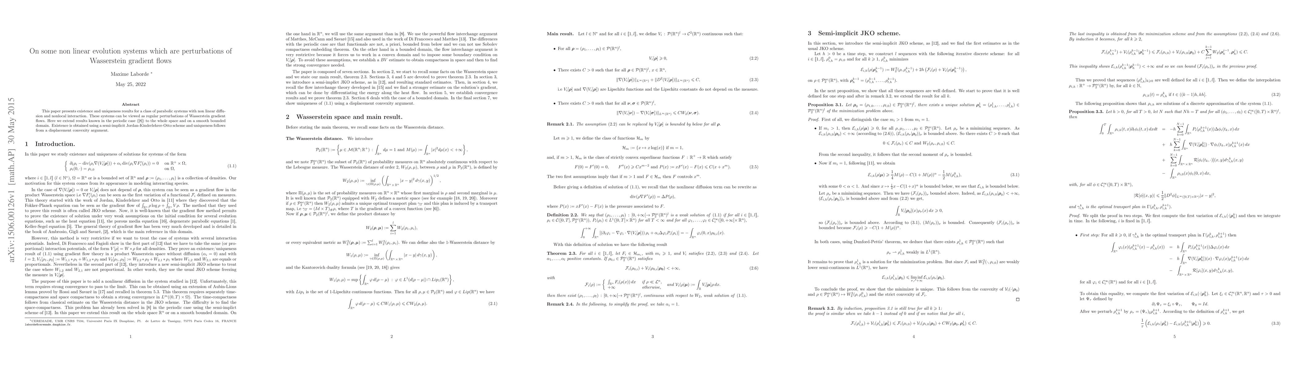This paper presents existence and uniqueness results for a class of parabolic systems with non linear diffusion and nonlocal interaction. These systems can be viewed as regular perturbations of Wasserstein gradient flows. Here we extend results known in the periodic case to the whole space and on a smooth bounded domain. Existence is obtained using a semi-implicit Jordan-Kinderlehrer-Otto scheme and uniqueness follows from a displacement convexity argument.