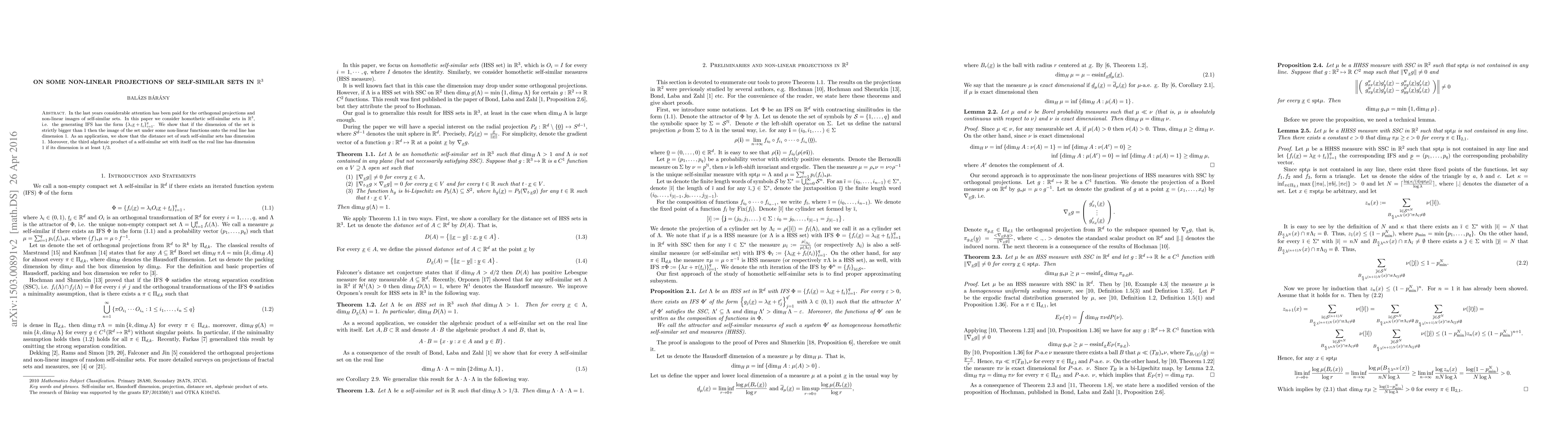 This paper investigates non-linear projections of self-similar sets in 3D space, showing that certain projections have a dimension of 1 if the set's dimension is strictly greater than 1.