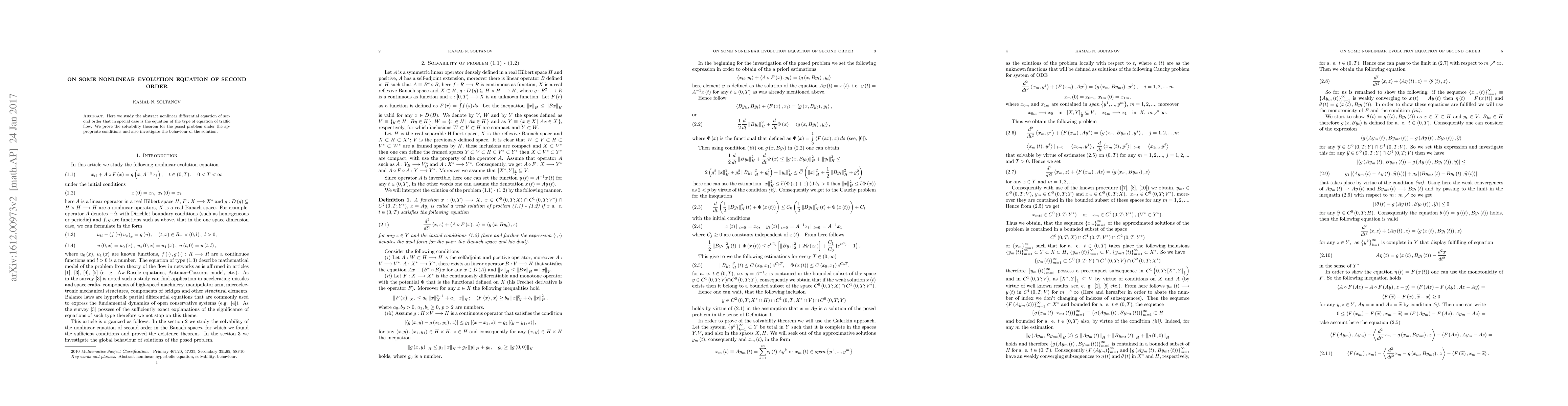 Here we study the abstract nonlinear differential equation of second order that in special case is the equation of the type of equation of traffic flow. We prove the solvability theorem for the posed problem under the appropriate conditions and also investigate the behaviour of the solution.