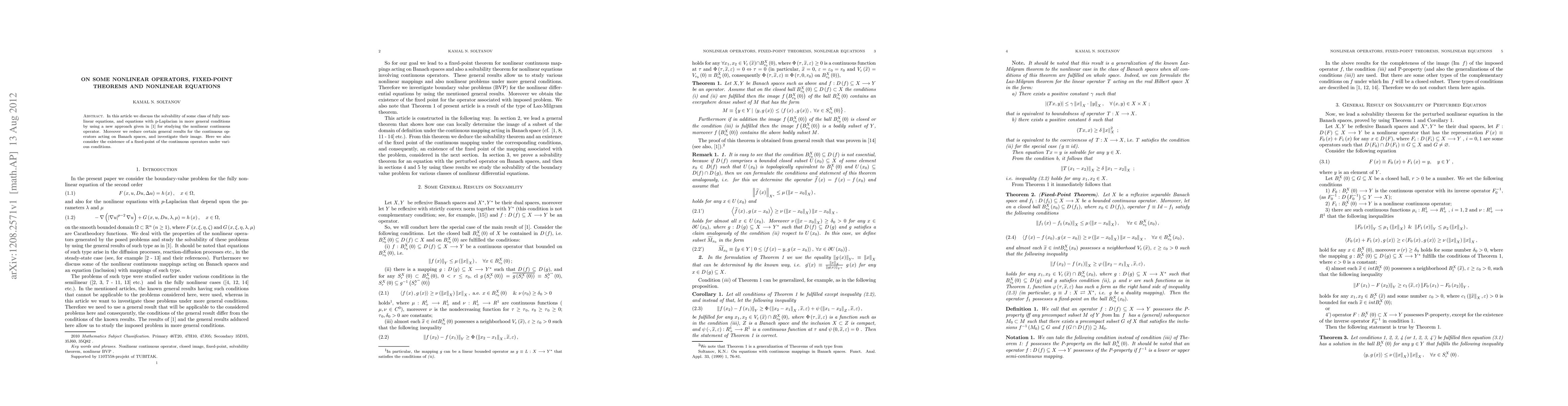 In this article we discuss the solvability of some class of fully nonlinear equations, and equations with p-Laplacian in more general conditions by using a new approach given in [1] for studying the nonlinear continuous operator. Moreover we reduce certain general results for the continuous operators acting on Banach spaces, and investigate their image. Here we also consider the existence of a fixed-point of the continuous operators under various conditions.