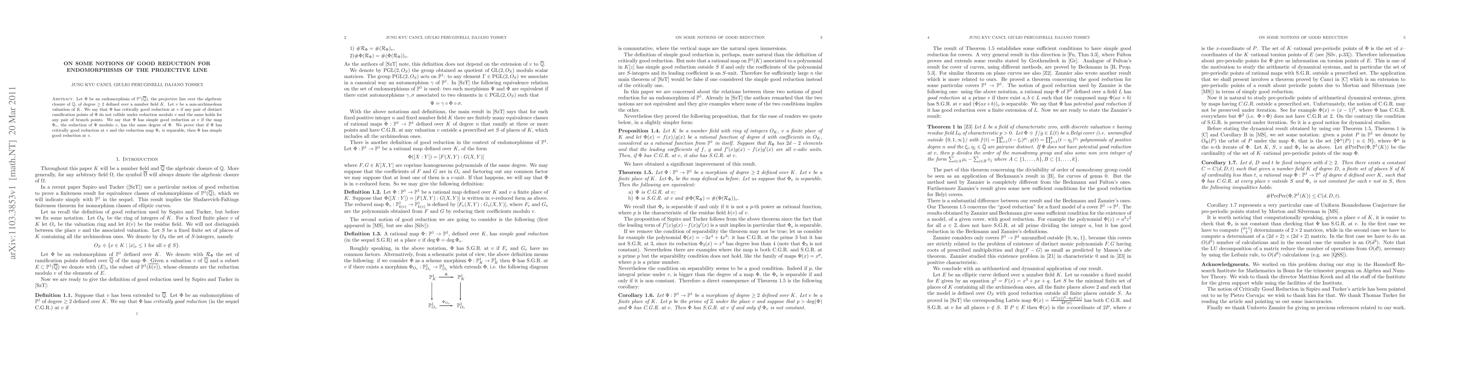 Let $\Phi$ be an endomorphism of $\SR(\bar{\Q})$, the projective line over the algebraic closure of $\Q$, of degree $\geq2$ defined over a number field $K$. Let $v$ be a non-archimedean valuation of $K$. We say that $\Phi$ has critically good reduction at $v$ if any pair of distinct ramification points of $\Phi$ do not collide under reduction modulo $v$ and the same holds for any pair of branch points. We say that $\Phi$ has simple good reduction at $v$ if the map $\Phi_v$, the reduction of $\Phi$ modulo $v$, has the same degree of $\Phi$. We prove that if $\Phi$ has critically good reduction at $v$ and the reduction map $\Phi_v$ is separable, then $\Phi$ has simple good reduction at $v$.