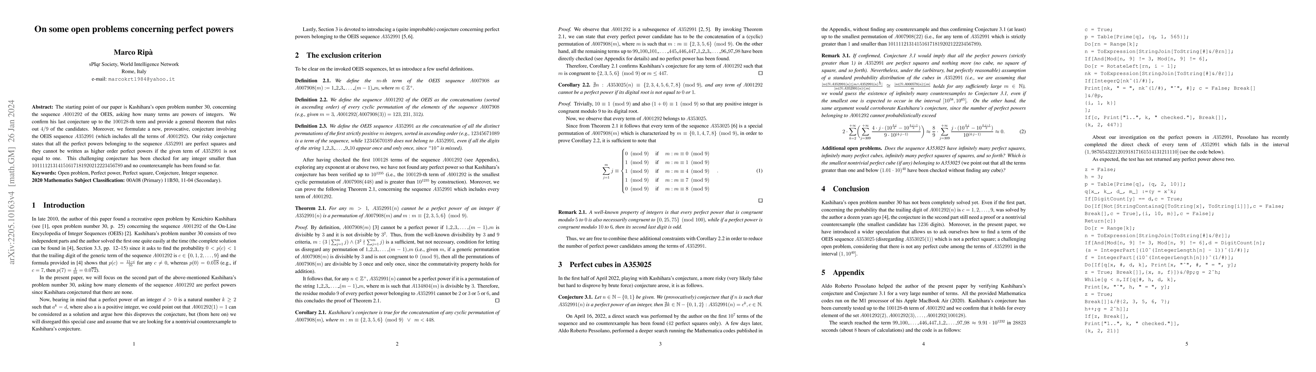 The starting point of our paper is Kashihara's open problem number $30$, concerning the sequence $A001292$ of the OEIS, asking how many terms are powers of integers. We confirm his last conjecture up to the $100128$-th term and provide a general theorem that rules out $4/9$ of the candidates. Moreover, we formulate a new, provocative, conjecture involving the OEIS sequence $A352991$ (which includes all the terms of $A001292$). Our risky conjecture states that all the perfect powers belonging to the sequence $A352991$ are perfect squares and they cannot be written as higher order perfect powers if the given term of $A352991$ is not equal to one. This challenging conjecture has been checked for any integer smaller than $10111121314151617181920212223456789$ and no counterexample has been found so far.