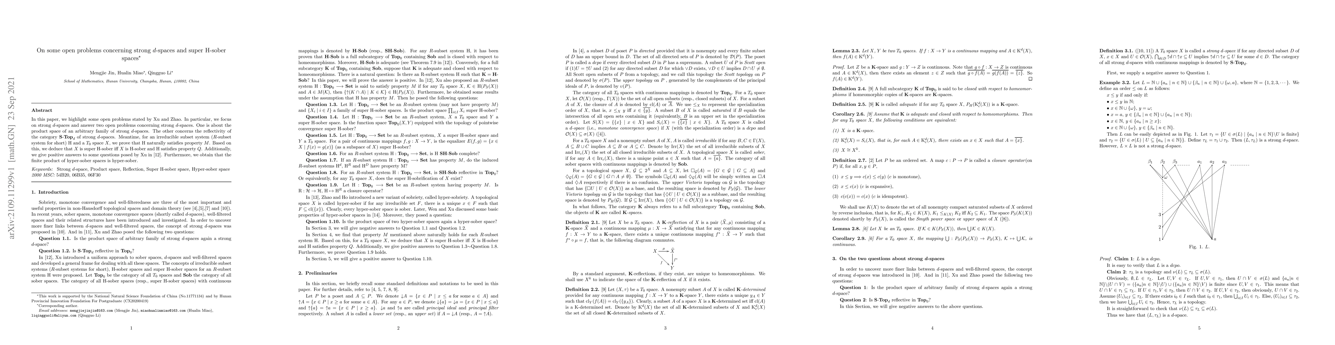 This paper addresses open problems in topology related to strong $d$-spaces and super $\mathrm{H}$-sober spaces, solving two specific problems about the product of strong $d$-spaces and reflectivity. It also proves that an irreducible subset system $\mathrm{H}$ satisfies property $M$ and deduces conditions for a $T_{0}$ space $X$ to be super $\mathrm{H}$-sober.