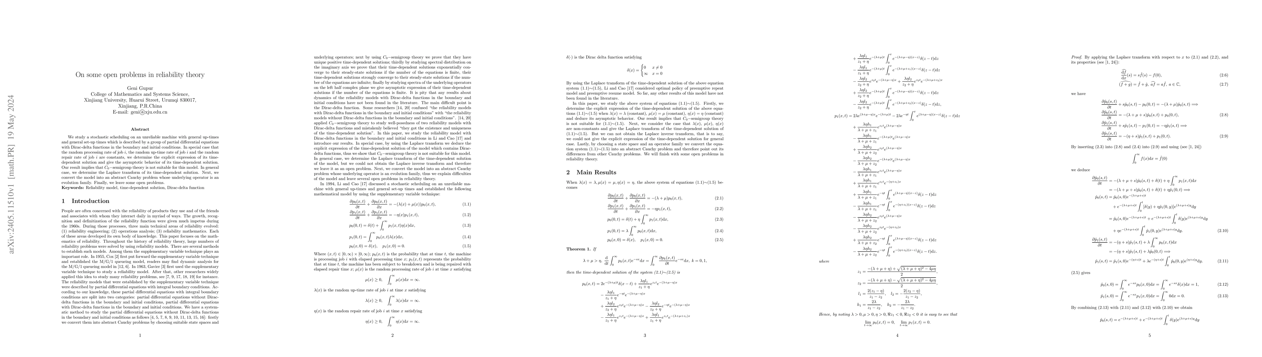 We study a stochastic scheduling on an unreliable machine with general up-times and general set-up times which is described by a group of partial differential equations with Dirac-delta functions in the boundary and initial conditions. In special case that the random processing rate of job $i,$ the random up-time rate of job $i$ and the random repair rate of job $i$ are constants, we determine the explicit expression of its time-dependent solution and give the asymptotic behavior of its time-dependent solution. Our result implies that $C_0-$semigroup theory is not suitable for this model. In general case, we determine the Laplace transform of its time-dependent solution. Next, we convert the model into an abstract Cauchy problem whose underlying operator is an evolution family. Finally, we leave some open problems.