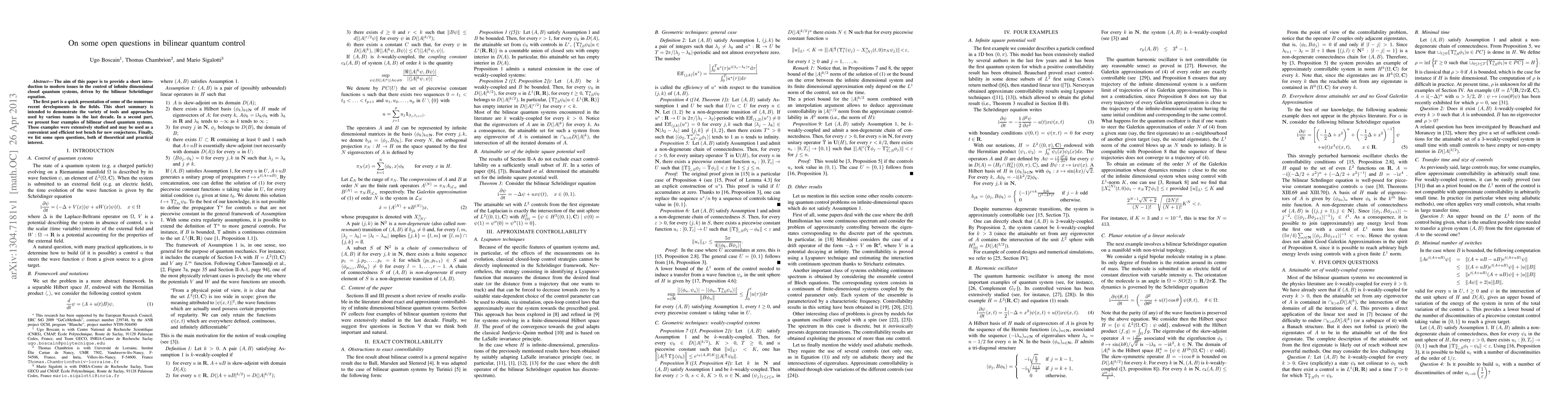 The aim of this paper is to provide a short introduction to modern issues in the control of infinite dimensional closed quantum systems, driven by the bilinear Schr\"odinger equation. The first part is a quick presentation of some of the numerous recent developments in the fields. This short summary is intended to demonstrate the variety of tools and approaches used by various teams in the last decade. In a second part, we present four examples of bilinear closed quantum systems. These examples were extensively studied and may be used as a convenient and efficient test bench for new conjectures. Finally, we list some open questions, both of theoretical and practical interest.