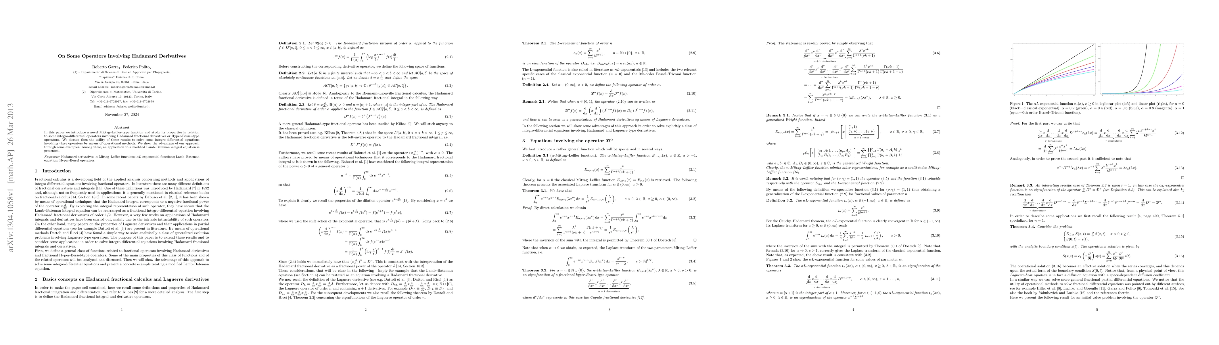 In this paper we introduce a novel Mittag--Leffler-type function and study its properties in relation to some integro-differential operators involving Hadamard fractional derivatives or Hyper-Bessel-type operators. We discuss then the utility of these results to solve some integro-differential equations involving these operators by means of operational methods. We show the advantage of our approach through some examples. Among these, an application to a modified Lamb--Bateman integral equation is presented.