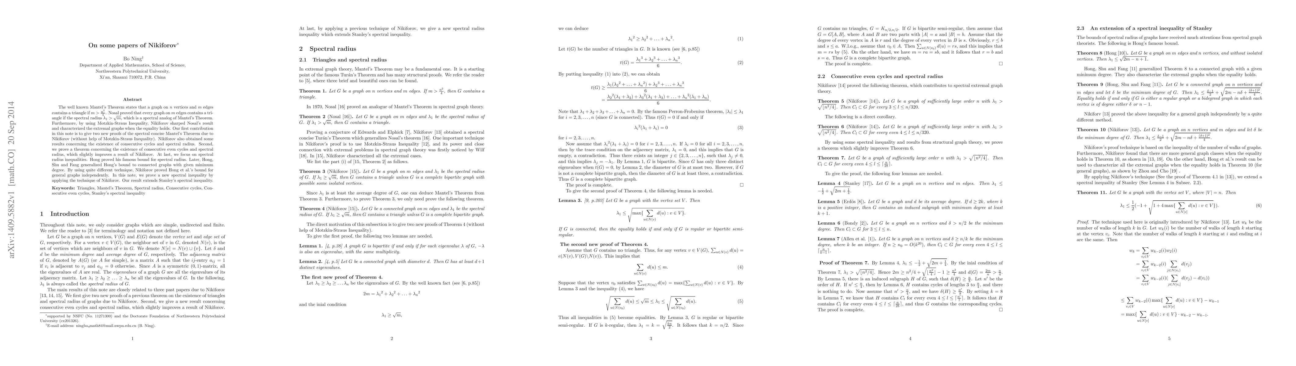 The well known Mantel's Theorem states that a graph on $n$ vertices and $m$ edges contains a triangle if $m>\frac{n^2}{4}$. Nosal proved that every graph on $m$ edges contains a triangle if the spectral radius $\lambda_1>\sqrt{m}$, which is a spectral analog of Mantel's Theorem. Furthermore, by using Motzkin-Straus Inequality, Nikiforov sharped Nosal's result and characterized the extremal graphs when the equality holds. Our first contribution in this note is to give two new proofs of the spectral concise Mantel's Theorem due to Nikiforov (without help of Motzkin-Straus Inequality). Nikiforov also obtained some results concerning the existence of consecutive cycles and spectral radius. Second, we prove a theorem concerning the existence of consecutive even cycles and spectral radius, which slightly improves a result of Nikiforov. At last, we focus on spectral radius inequalities. Hong proved his famous bound for spectral radius. Later, Hong, Shu and Fang generalized Hong's bound to connected graphs with given minimum degree. By using quite different technique, Nikiforov proved Hong et al.'s bound for general graphs independently. In this note, we prove a new spectral inequality by applying the technique of Nikiforov. Our result extends Stanley's spectral inequality.
