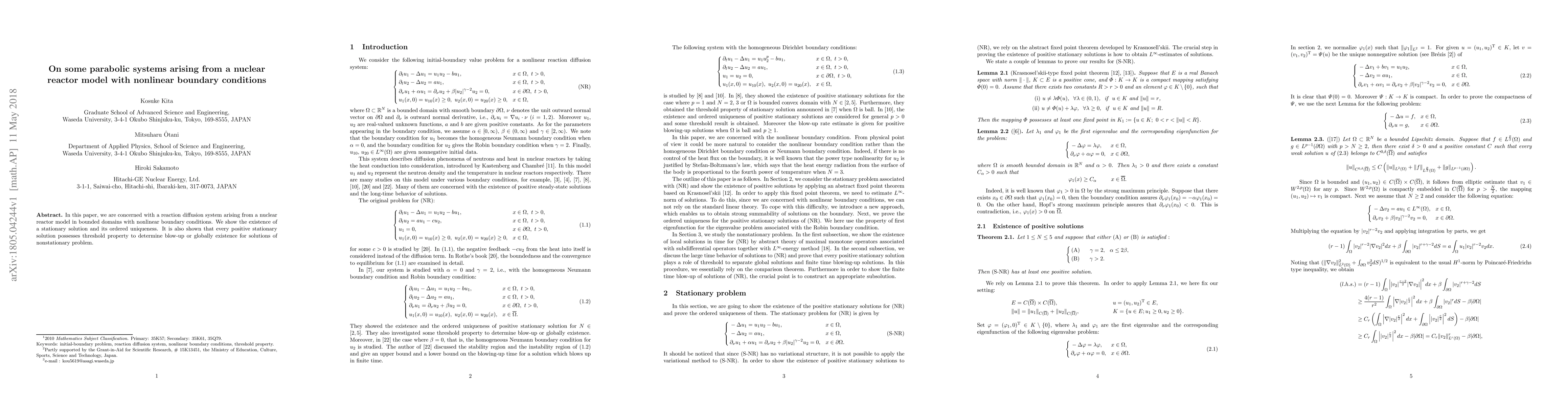 In this paper, we are concerned with a reaction diffusion system arising from a nuclear reactor model in bounded domains with nonlinear boundary conditions. We show the existence of a stationary solution and its ordered uniqueness. It is also shown that every positive stationary solution possesses threshold property to determine blow-up or globally existence for solutions of nonstationary problem.