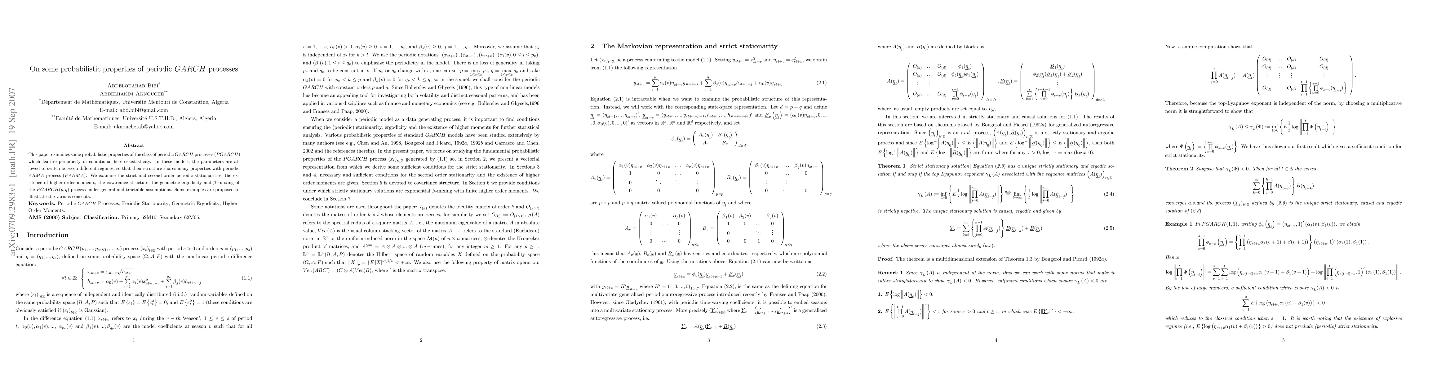 This paper investigates the probabilistic properties of periodic GARCH (Gaussian Autoregressive Conditional Heteroskedasticity) processes, finding that they exhibit certain patterns under general assumptions, with applications in finance and time series analysis.