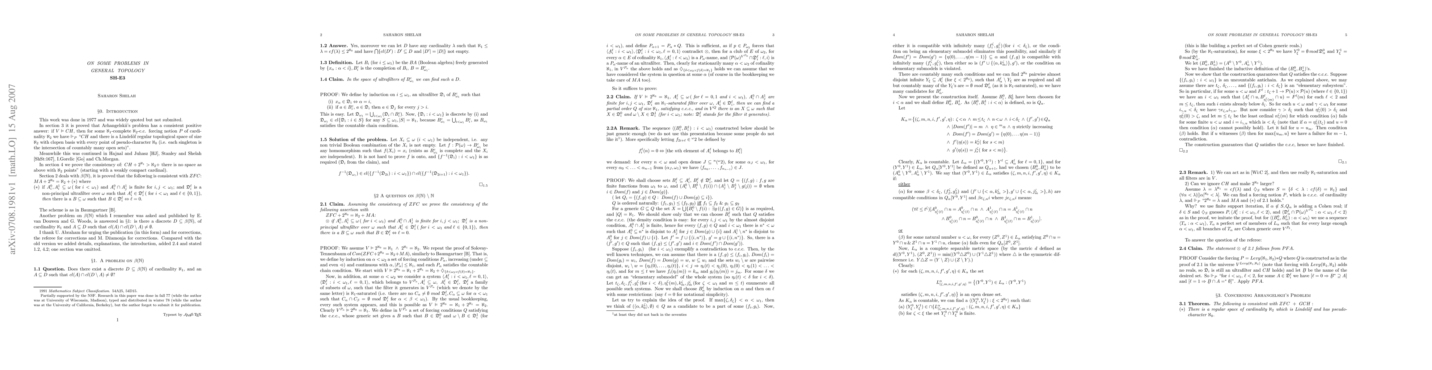 This research paper in general topology proves Arhangelskii's problem has a consistent positive solution under the assumption of the Continuum Hypothesis (CH), constructing a specific forcing notion. It also establishes the consistency of CH combined with the inexistence of a Lindelof regular topological space of size aleph_2 with specified properties, starting from a weakly compact cardinal.