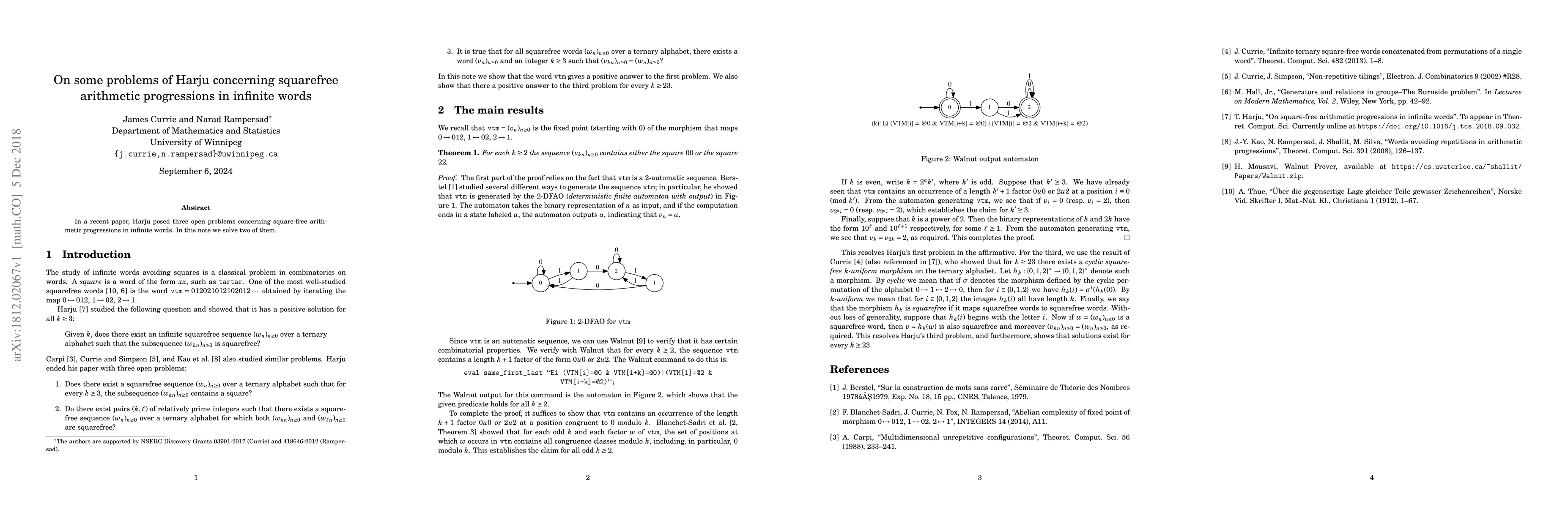 In a recent paper, Harju posed three open problems concerning square-free arithmetic progressions in infinite words. In this note we solve two of them.