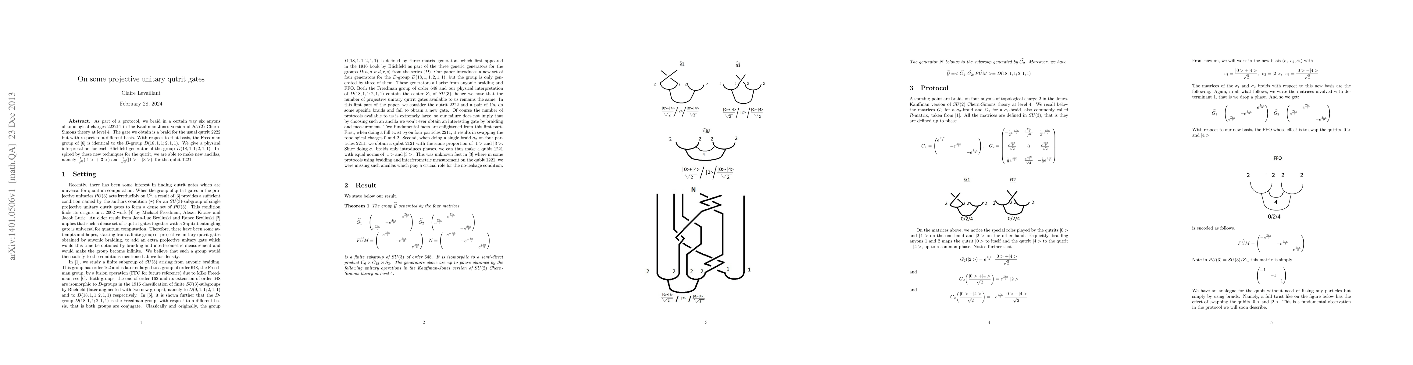 As part of a protocol, we braid in a certain way six anyons of topological charges $222211$ in the Kauffman-Jones version of $SU(2)$ Chern-Simons theory at level $4$. The gate we obtain is a braid for the usual qutrit $2222$ but with respect to a different basis. With respect to that basis, the Freedman group of \cite{LEV} is identical to the $D$-group $D(18,1,1;2,1,1)$. We give a physical interpretation for each Blichfeld generator of the group $D(18,1,1;2,1,1)$. Inspired by these new techniques for the qutrit, we are able to make new ancillas, namely $\frac{1}{\sqrt{2}}(|1>\,+|3>)$ and $\frac{1}{\sqrt{2}}(|1>\,-|3>)$, for the qubit $1221$.