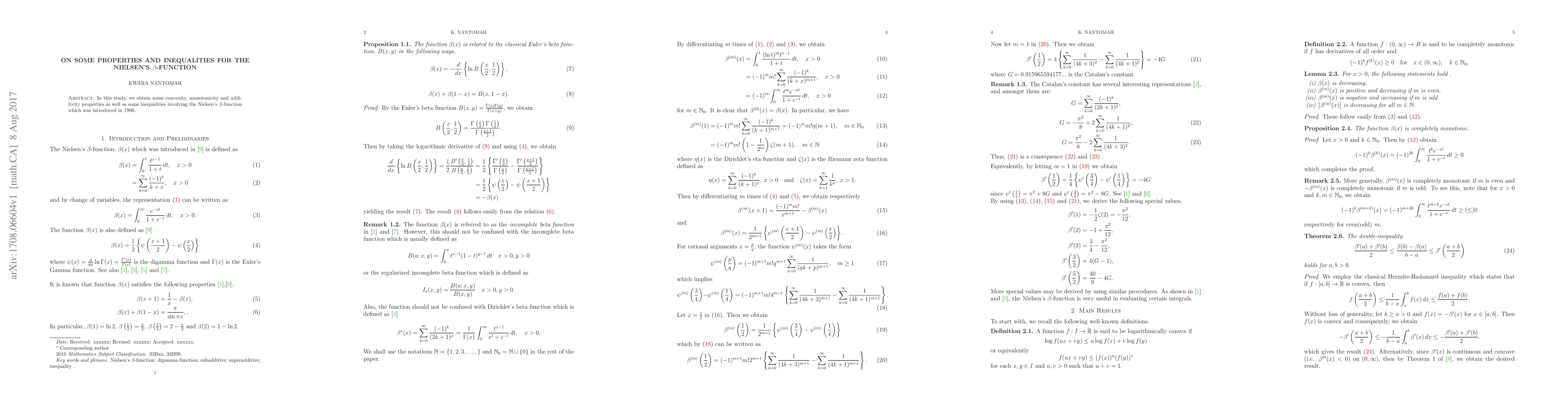 In this study, we obtain some convexity, monotonicity and additivity properties as well as some inequalities involving the Nielsen's $\beta$-function which was introduced in 1906.