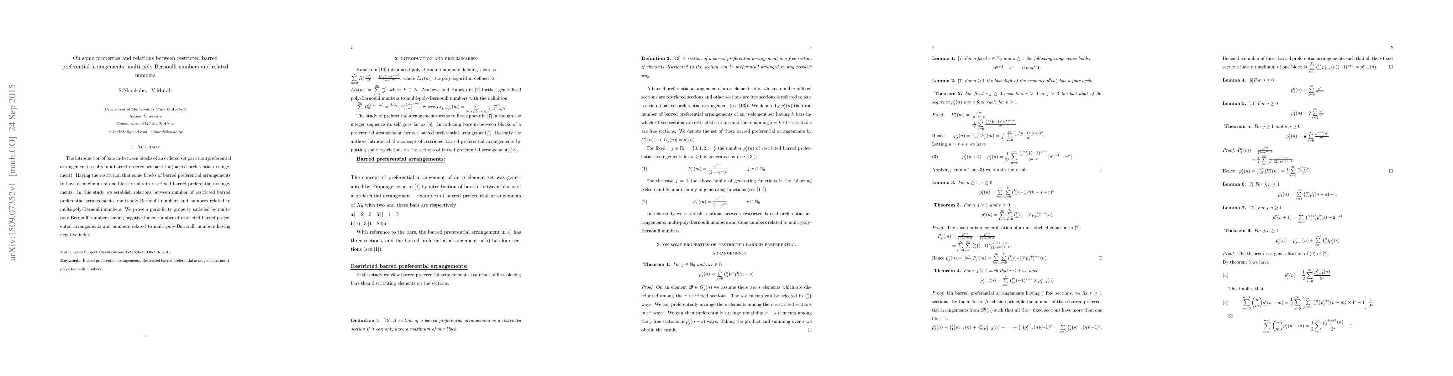 The introduction of bars in-between blocks of an ordered set partition(preferential arrangement) results in a barred ordered set partition(barred preferential arrange- ment). Having the restriction that some blocks of barred preferential arrangements to have a maximum of one block results in restricted barred preferential arrange- ments. In this study we establish relations between number of restricted barred preferential arrangements, multi-poly-Bernoulli numbers and numbers related to multi-poly-Bernoulli numbers. We prove a periodicity property satisfied by multi- poly-Bernoulli numbers having negative index, number of restricted barred prefer- ential arrangements and numbers related to multi-poly-Bernoulli numbers having negative index.