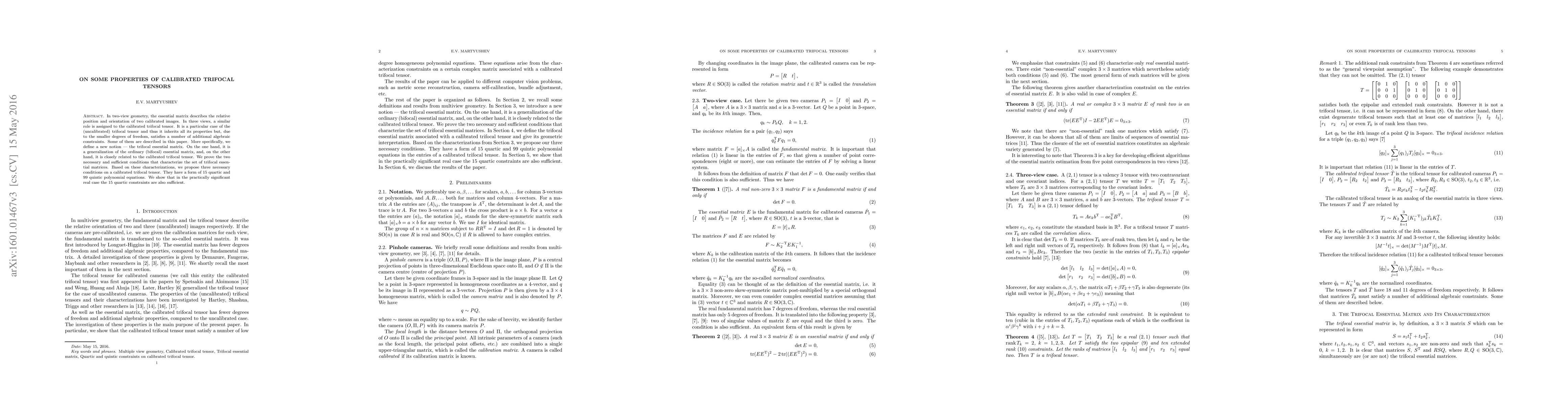This paper explores properties of calibrated trifocal tensors in three-view geometry, defining a new concept called the trifocal essential matrix. It establishes necessary and sufficient conditions for this matrix and proposes three conditions for calibrated trifocal tensors, represented by 15 quartic and 99 quintic polynomial equations, with the quartic constraints being sufficient in practical scenarios.