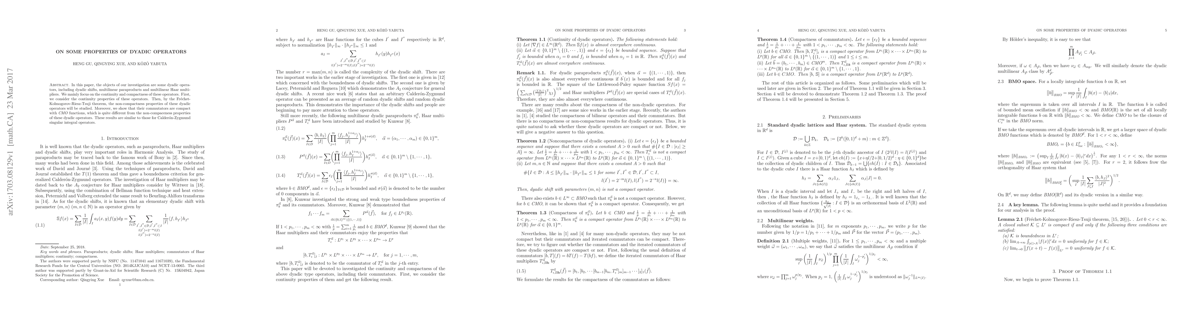 This paper investigates the continuity and compactness properties of dyadic operators, including shifts, paraproducts, and Haar multipliers. It demonstrates that while the operators themselves may be non-compact, their commutators with \textit{CMO} functions are compact, akin to results for Calderón-Zygmund operators.