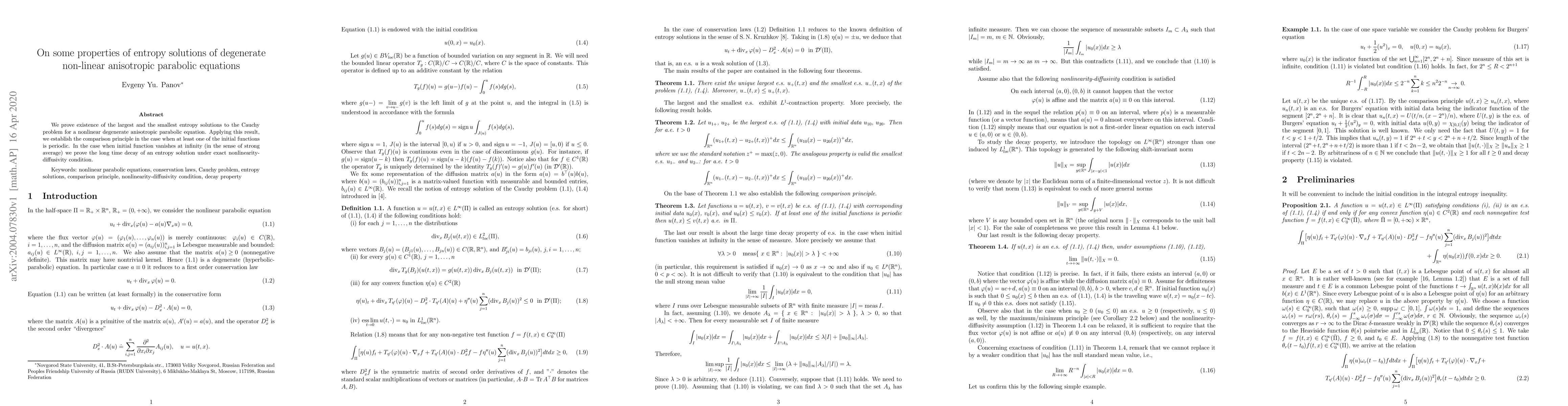 This research proves the existence of maximum and minimum entropy solutions for a nonlinear, degenerate, anisotropic parabolic equation's Cauchy problem. It also establishes a comparison principle when initial functions are periodic, and demonstrates long-term decay of entropy solutions under specific nonlinearity-diffusivity conditions when initial functions vanish at infinity.