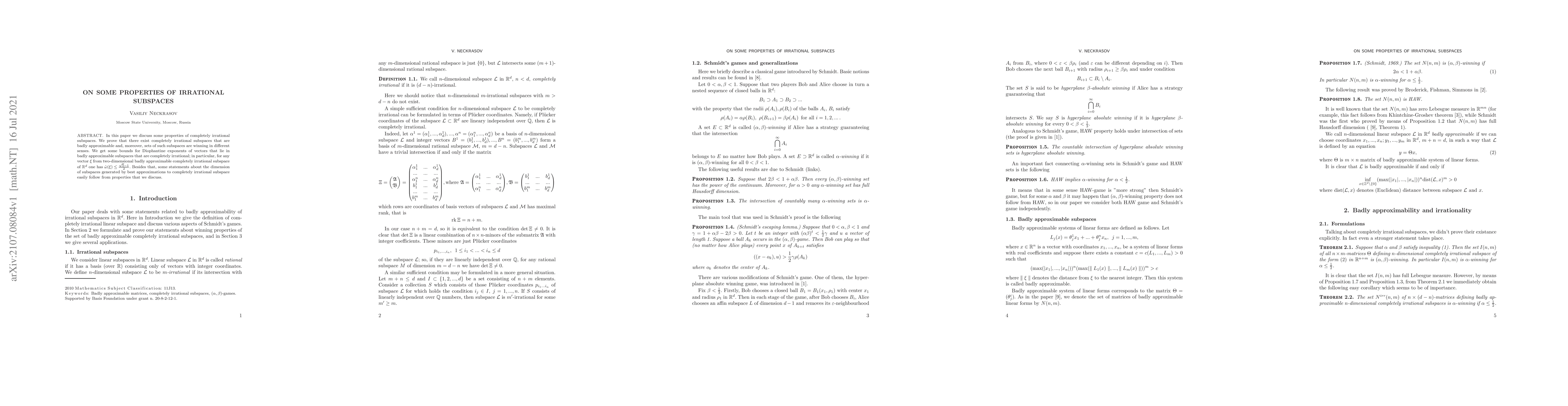 This paper explores the properties of completely irrational subspaces, proving the existence of badly approximable subspaces and establishing bounds for their Diophantine exponents. It also discusses the dimension of subspaces generated by best approximations to these completely irrational subspaces.