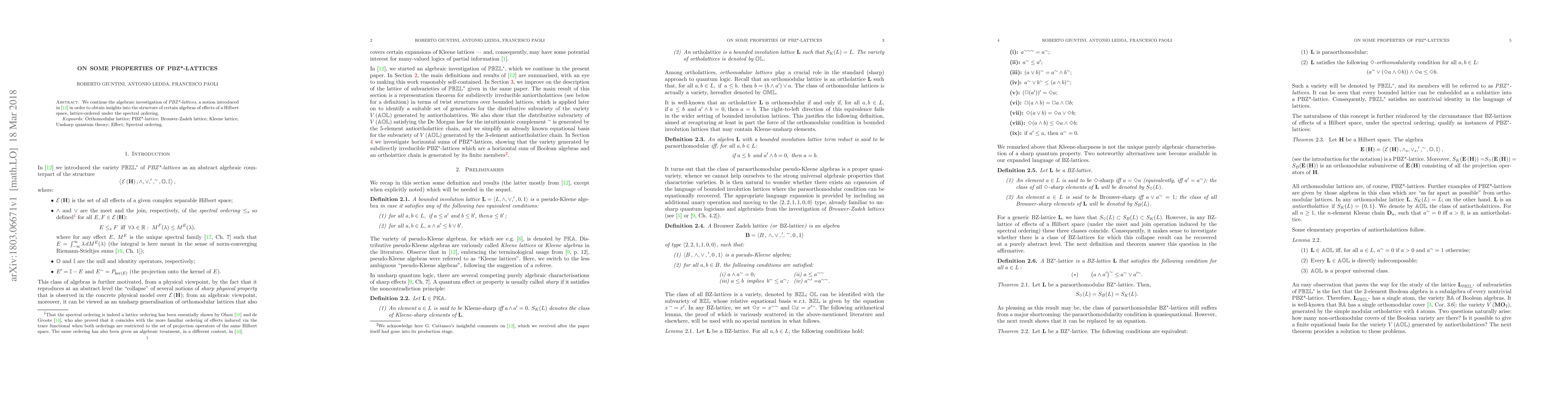 This paper investigates properties of PBZ*-lattices to understand certain algebras of effects in Hilbert spaces. It explores the structure of these lattices using algebraic methods.