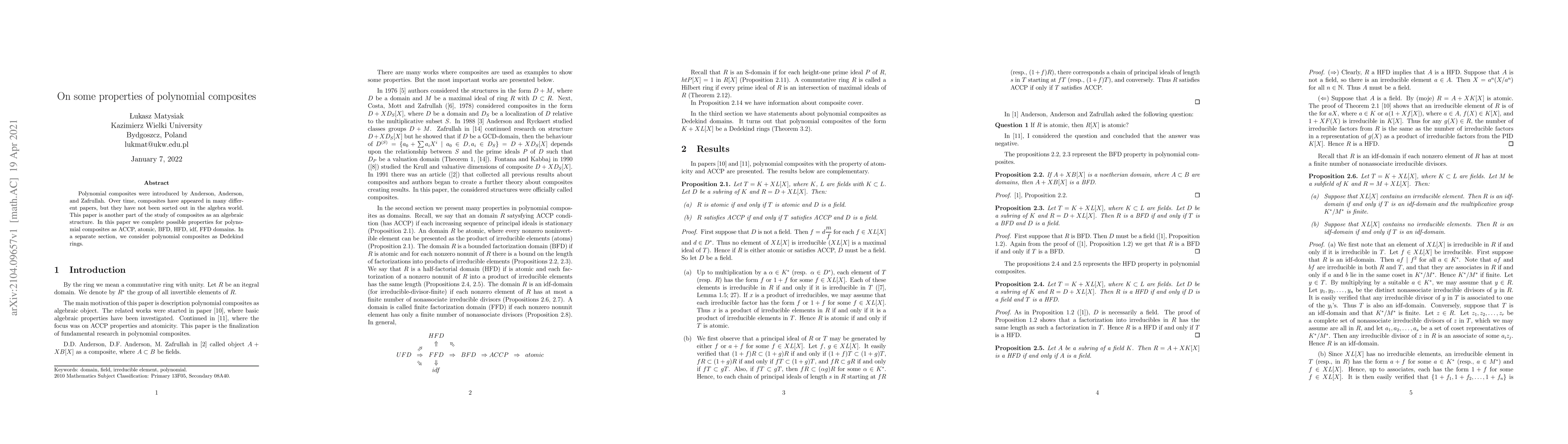 This paper explores the algebraic structure of polynomial composites, establishing properties such as ACCP, atomic, BFD, HFD, idf, and FFD domains, and examines their characteristics as Dedekind rings.