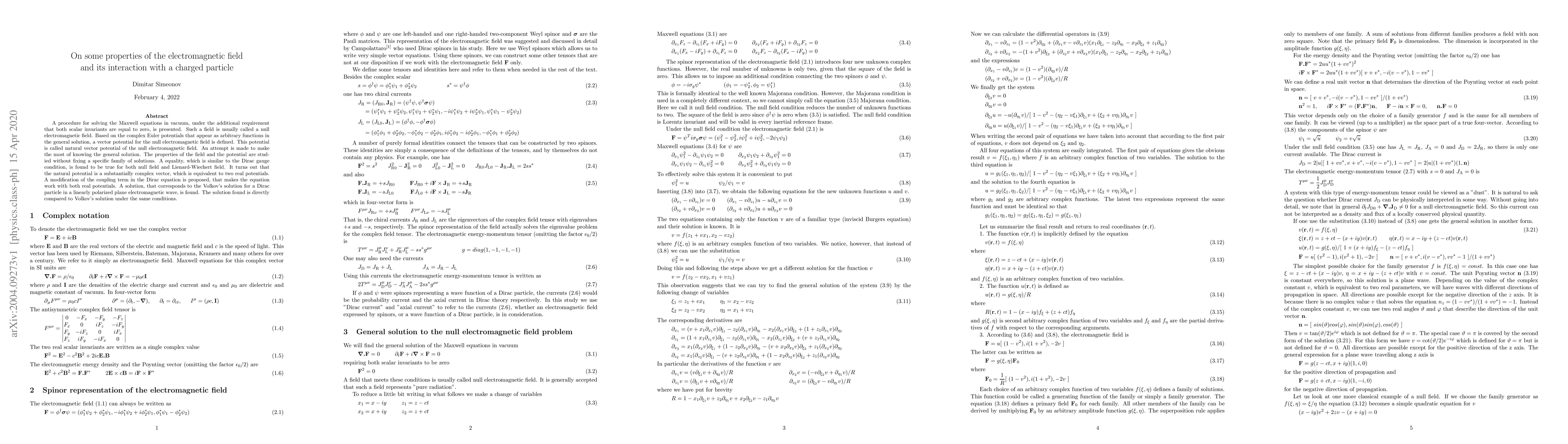 A procedure for solving the Maxwell equations in vacuum, under the additional requirement that both scalar invariants are equal to zero, is presented. Such a field is usually called a null electromagnetic field. Based on the complex Euler potentials that appear as arbitrary functions in the general solution, a vector potential for the null electromagnetic field is defined. This potential is called natural vector potential of the null electromagnetic field. An attempt is made to make the most of knowing the general solution. The properties of the field and the potential are studied without fixing a specific family of solutions. A equality, which is similar to the Dirac gauge condition, is found to be true for both null field and Lienard-Wiechert field. It turns out that the natural potential is a substantially complex vector, which is equivalent to two real potentials. A modification of the coupling term in the Dirac equation is proposed, that makes the equation work with both real potentials. A solution, that corresponds to the Volkov's solution for a Dirac particle in a linearly polarized plane electromagnetic wave, is found. The solution found is directly compared to Volkov's solution under the same conditions.