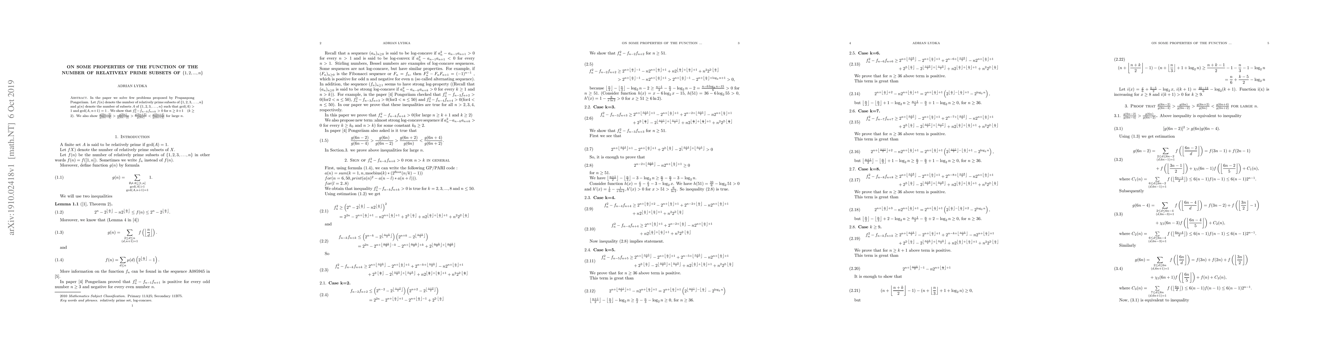In the paper we solve few problems proposed by Prapanpong Pongsriiam. Let $f(n)$ denote the number of relatively prime subsets of $\{1, 2, 3, \dots, n\}$ and $g(n)$ denote the number of subsets $A$ of $\{1, 2, 3, \dots, n\}$ such that gcd$(A)>1$ and gcd$(A, n+1)=1$ . We show that $f_n^2-f_{n-k}f_{n+k}>0$ for $n\geq k+1\quad (k\geq2)$. We also show $\frac{g(6n-2)}{g(6n-4)}>\frac{g(6n)}{g(6n-2)}>\frac{g(6n+2)}{g(6n)}<\frac{g(6n+4)}{g(6n+2)}$ for large $n$.