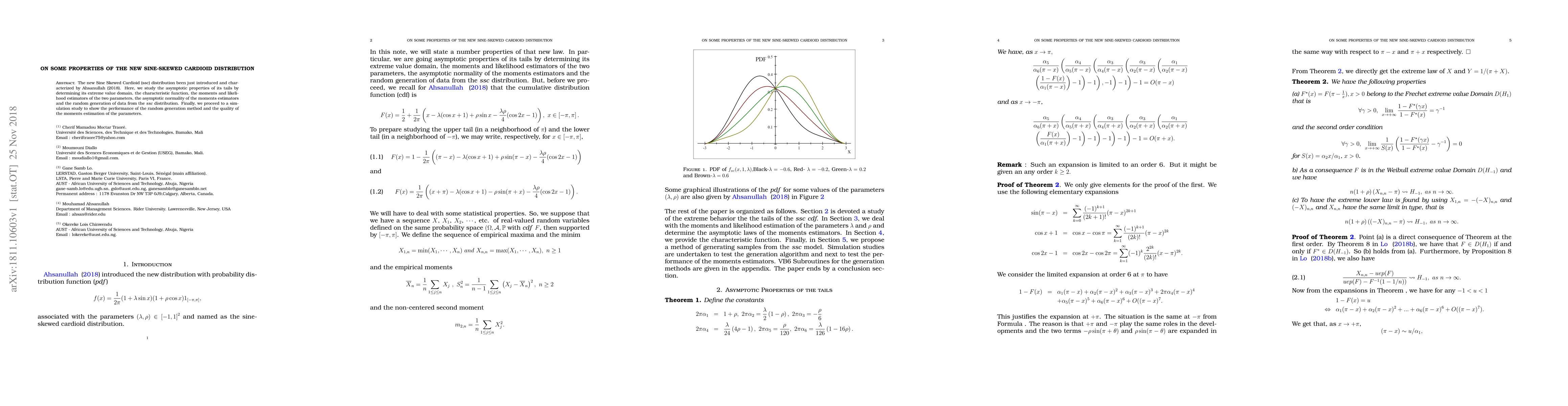 The new Sine Skewed Cardioid (ssc) distribution been just introduced and characterized by Ahsanullah (2018). Here, we study the asymptotic properties of its tails by determining its extreme value domain, the characteristic function, the moments and likelihood estimators of the two parameters, the asymptotic normality of the moments estimators and the random generation of data from the \textit{ssc} distribution. Finally, we proceed to a simulation study to show the performance of the random generation method and the quality of the moments estimation of the parameters.
