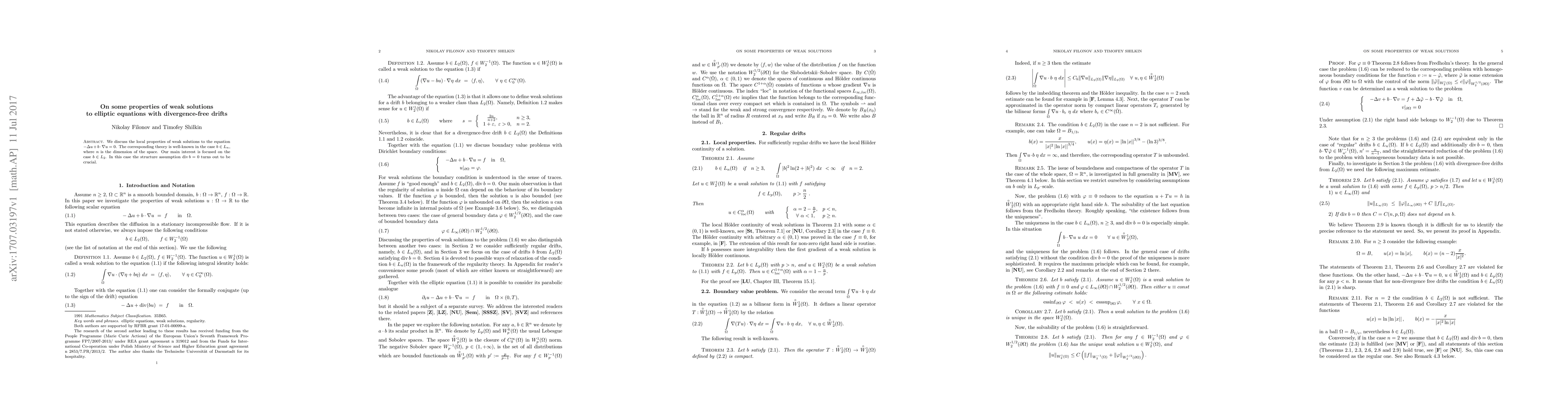 This paper investigates local properties of weak solutions to elliptic equations with divergence-free drifts, focusing on the case where b is in L_2, a weaker norm than commonly used L_n.
