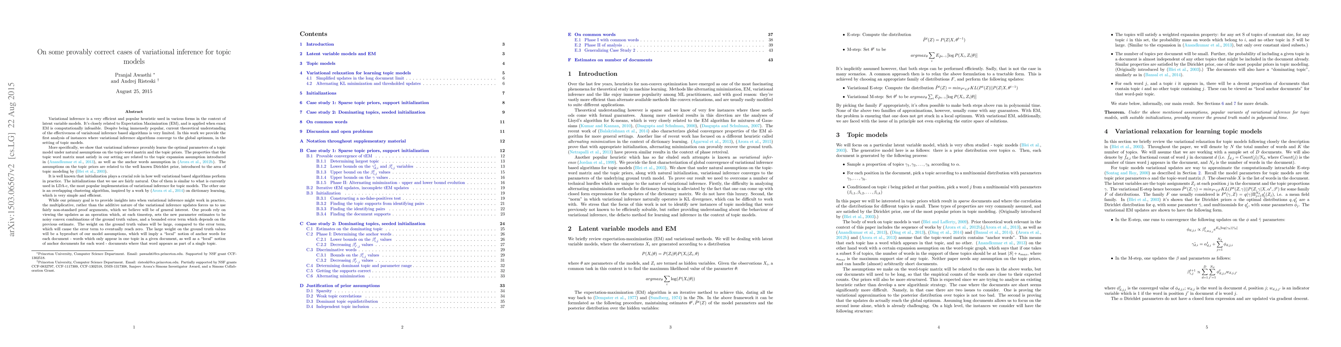 This paper analyzes variational inference algorithms for topic models, proving that they converge to the global optimum under specific assumptions on the topic-word matrix and Dirichlet priors. The study introduces novel initialization methods and non-standard proof techniques to address the multiplicative nature of variational updates.