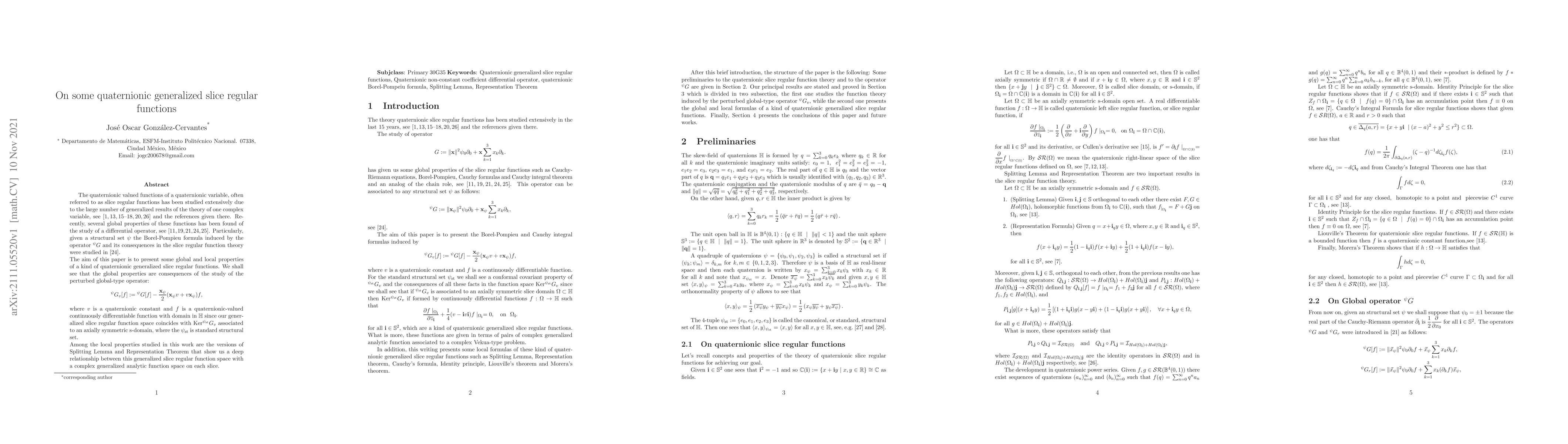 The quaternionic valued functions of a quaternionic variable, often referred to as slice regular functions has been studied extensively due to the large number of generali\-zed results of the theory of one complex variable, see \cite{cgs,CSS,GSC,GS2,gssbook,gp,gpr,GS} and the references given there. Recently, several global properties of these functions has been found of the study of a differential operator, see \cite{GlobalOp,GP_2, G, GG1,GG2}. Particularly, given a structural set $\psi$ the Borel-Pompieu formula induced by the operator ${}^{\psi}G$ and its consequences in the slice regular function theory were studied in \cite{GG1}. The aim of this paper is to present some global and local properties of a kind of quaternionic generalized slice regular functions. We shall see that the global properties are consequences of the study of the perturbed global-type operator: \begin{align*} {}^{\psi}G_v [f] := {}^{\psi} G [f] -\frac{{\bf x}_{\psi}}{ 2} ({\bf x}_{\psi} v + v {\bf x}_{\psi} ) f , \end{align*} where $v$ is a quaternionic constant and $f$ is a quaternionic-valued continuously differentiable function with domain in $\mathbb H$ since our generalized slice regular function space coincides with $\textrm{Ker} {}^{\psi_{\textrm{st}}}G_v$ associated to an axially symmetric s-domain, where the $\psi_{\textrm{st}}$ is standard structural set. Among the local properties studied in this work are the versions of Splitting Lemma and Representation Theorem that show us a deep relationship between this generalized slice regular function space with a complex generalized analytic function space on each slice.