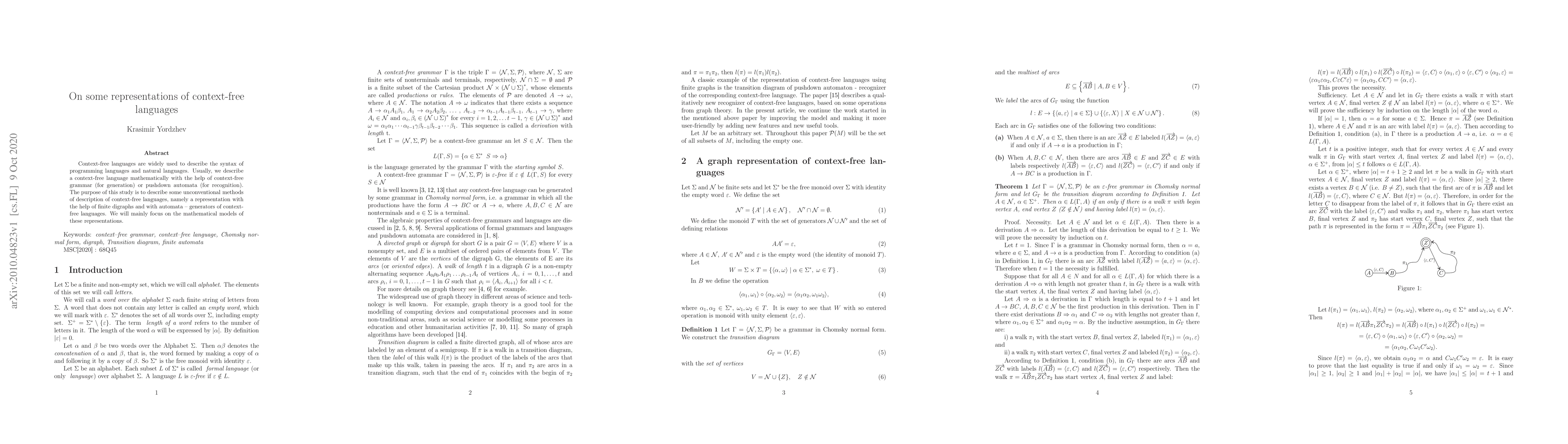 This study explores unconventional methods for describing context-free languages, focusing on representations using finite digraphs and automata generators, alongside traditional context-free grammars and pushdown automata. The paper emphasizes the mathematical models underlying these novel representations.