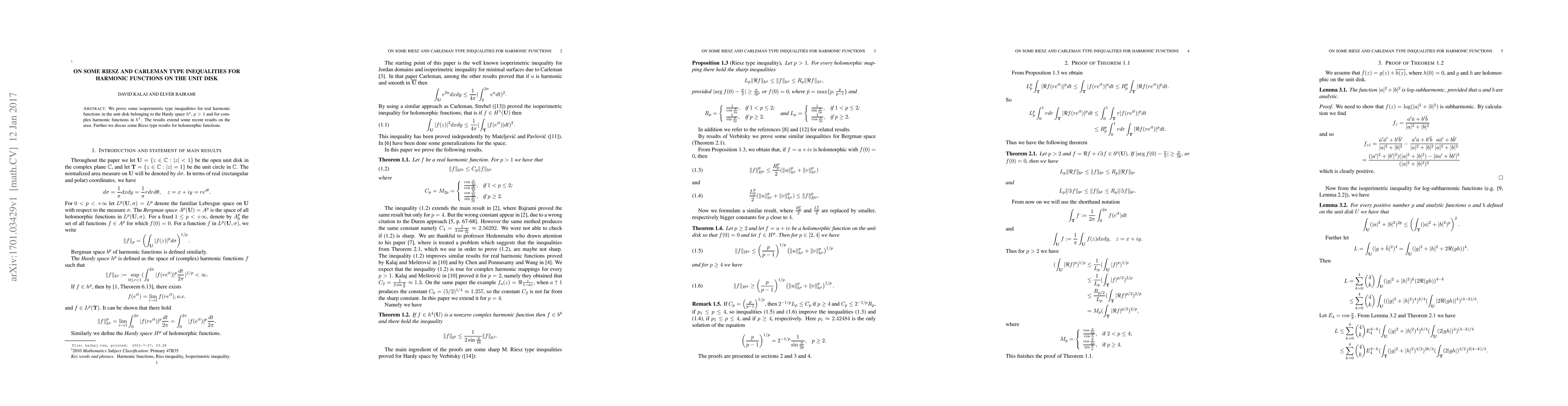 We prove some isoperimetric type inequalities for real harmonic functions in the unit disk belonging to the Hardy space $h^p$, $p>1$ and for complex harmonic functions in $h^4$. The results extend some recent results on the area. Further we discus some Riesz type results for holomorphic functions.