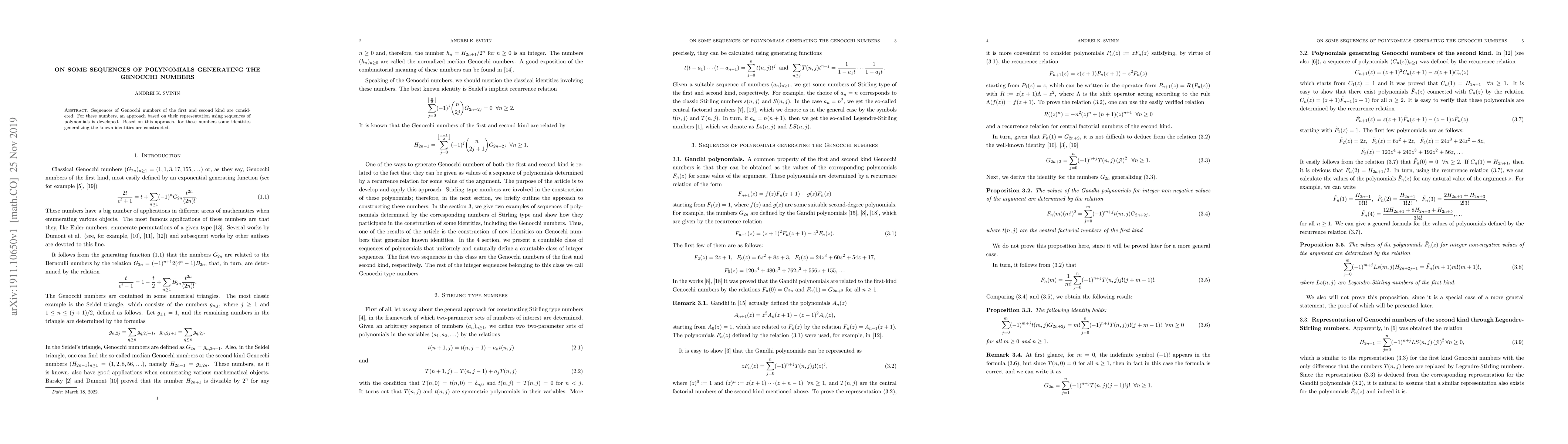 This paper explores sequences of polynomials that generate the Genocchi numbers of the first and second kind, developing a new representation approach. It constructs new identities generalizing previously known ones based on this polynomial representation.