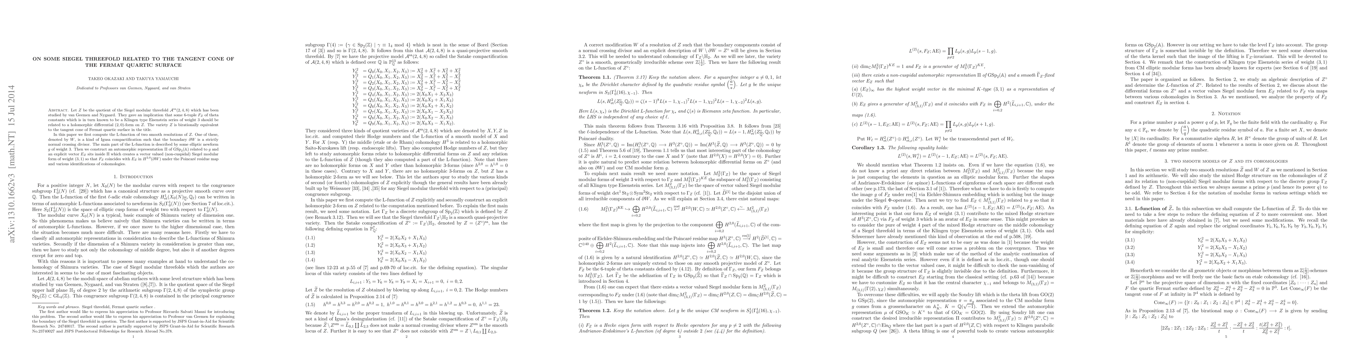 Let $Z$ be the quotient of the Siegel modular threefold $\mathcal{A}^{{\rm sa}}(2,4,8)$ which has been studied by van Geemen and Nygaard. They gave an implication that some 6-tuple $F_Z$ of theta constants which is in turn known to be a Klingen type Eisenstein series of weight 3 should be related to a holomorphic differential $(2,0)$-form on $Z$. The variety $Z$ is birationally equivalent to the tangent cone of Fermat quartic surface in the title. In this paper we first compute the L-function of two smooth resolutions of $Z$. One of these, denoted by $W$, is a kind of Igusa compactification such that the boundary $\partial W$ is a strictly normal crossing divisor. The main part of the L-function is described by some elliptic newform $g$ of weight 3. Then we construct an automorphic representation $\Pi$ of ${\rm GSp}_2(\A)$ related to $g$ and an explicit vector $E_Z$ sits inside $\Pi$ which creates a vector valued (non-cuspidal) Siegel modular form of weight $(3,1)$ so that $F_Z$ coincides with $E_Z$ in $H^{2,0}(\partial W)$ under the Poincar\'e residue map and various identifications of cohomologies.
