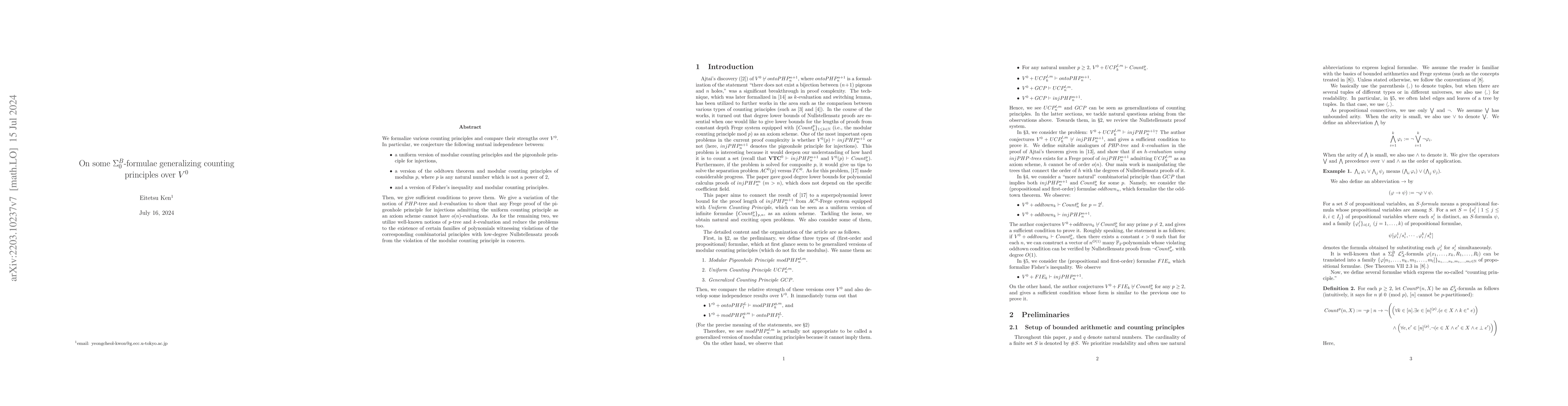 Ajtai's discovery of $V^{0}\not \vdash ontoPHP^{n+1}_{n}$, where $ontoPHP^{n+1}_{n}$ is a $\Sigma^{B}_{0}$ formalization of the statement "there does not exist a bijection between $(n+1)$ pigeons and $n$ holes," was a significant breakthrough in proof complexity, and there have been many interesting generalizations and variations of this result. In this paper, we first focus on the following result: for any $p \geq 2$, $V^{0}+Count^{p}_{k} \not \vdash injPHP^{n+1}_{n}$, where $Count^{p}_{k}$ denotes a $\Sigma^{B}_{0}$ formalization of the modular counting principle mod $p$ and $injPHP^{n+1}_{n}$ denotes that of the pigeonhole principle for injections. We try to make this result uniform for $p$. We give three types of (first-order and propositional) formulae which at first glance seem to be generalized versions of counting principles. In particular, we see two of them, $UCP^{l,d}_{n}$ and $GCP$, actually serve as uniform versions of $Count^{p}_{n}$ ($p \geq 2$). Then we conjecture that $V^{0}+UCP^{l,d}_{k} \not \vdash injPHP^{n+1}_{n}$, and give a sufficient condition to prove it. We also compare the strengths of oddtown theorem and Fisher's inequality with those of the modular counting principles over $V^0$ by stating some conjectures and giving sufficient conditions to prove them.