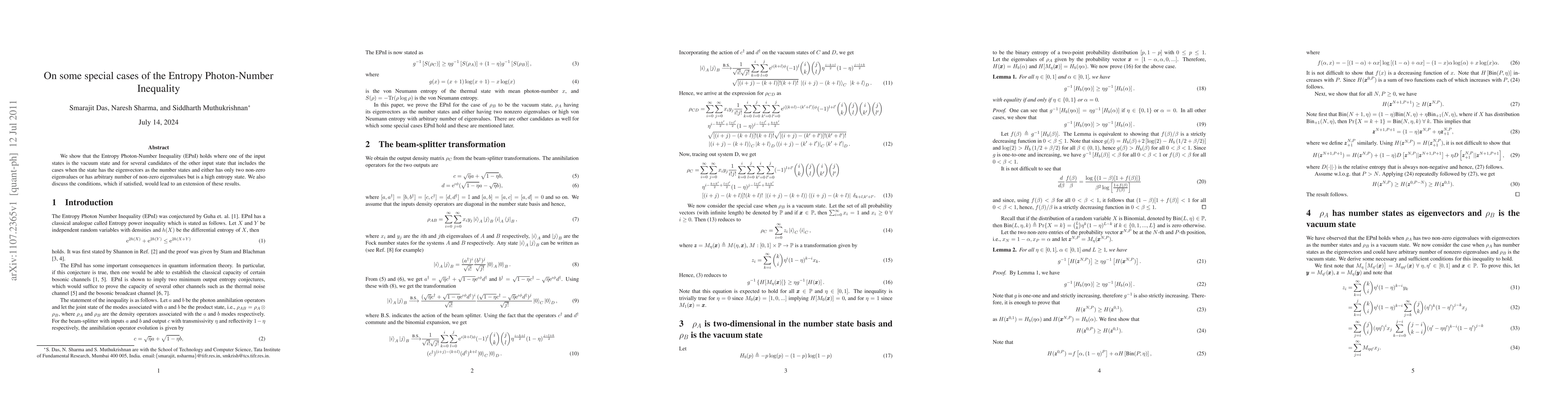 This paper demonstrates that the Entropy Photon-Number Inequality holds when one input state is the vacuum state and the other is a high entropy state, including number states with either two or multiple non-zero eigenvalues. It also explores conditions for extending these findings.
