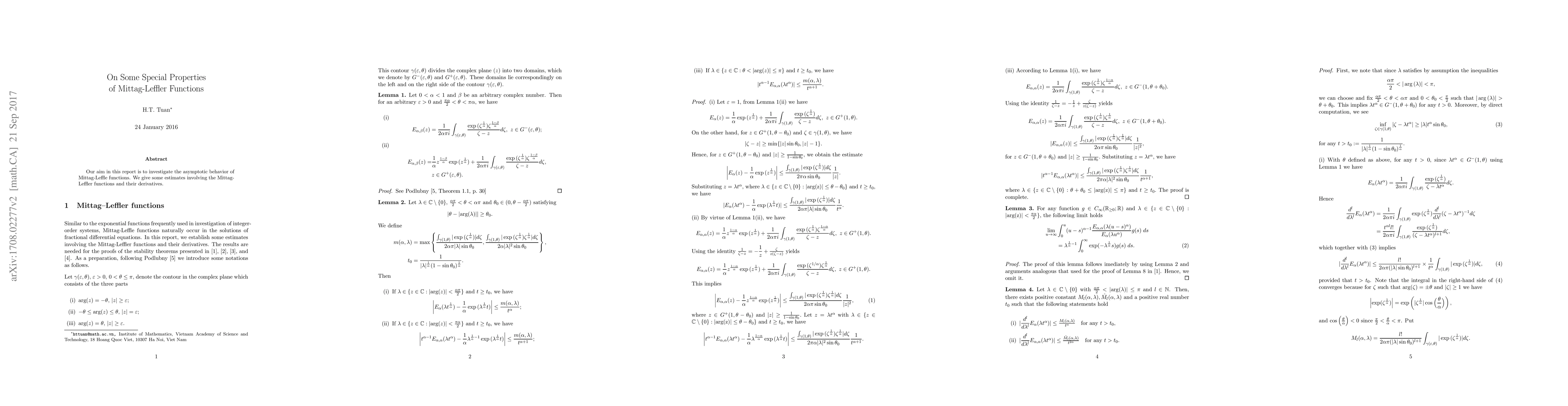 Summary: This paper explores the asymptotic properties of Mittag-Leffler functions, providing estimates for these functions and their derivatives. It focuses on understanding their long-term behavior.