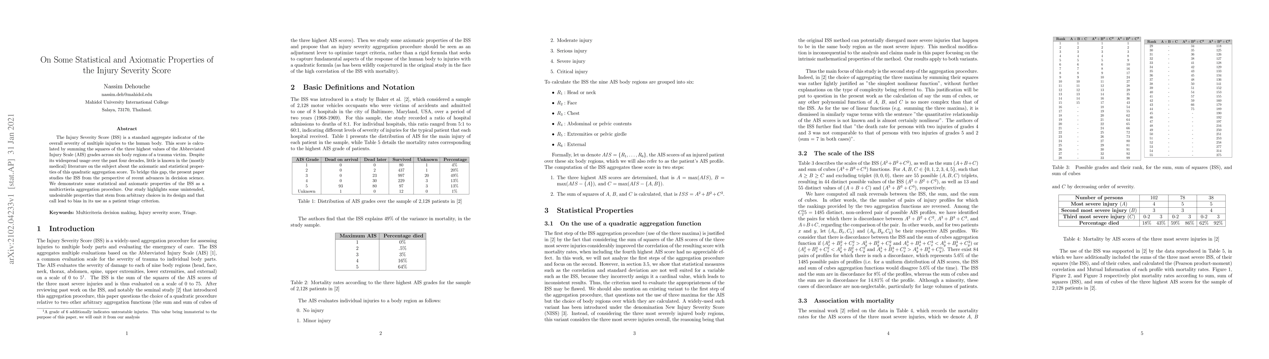 The Injury Severity Score (ISS) is a standard aggregate indicator of the overall severity of multiple injuries to the human body. This score is calculated by summing the squares of the three highest values of the Abbreviated Injury Scale (AIS) grades across six body regions of a trauma victim. Despite its widespread usage over the past four decades, little is known in the (mostly medical) literature on the subject about the axiomatic and statistical properties of this quadratic aggregation score. To bridge this gap, the present paper studies the ISS from the perspective of recent advances in decision science. We demonstrate some statistical and axiomatic properties of the ISS as a multicrtieria aggregation procedure. Our study highlights some unintended, undesirable properties that stem from arbitrary choices in its design and that call lead to bias in its use as a patient triage criterion.