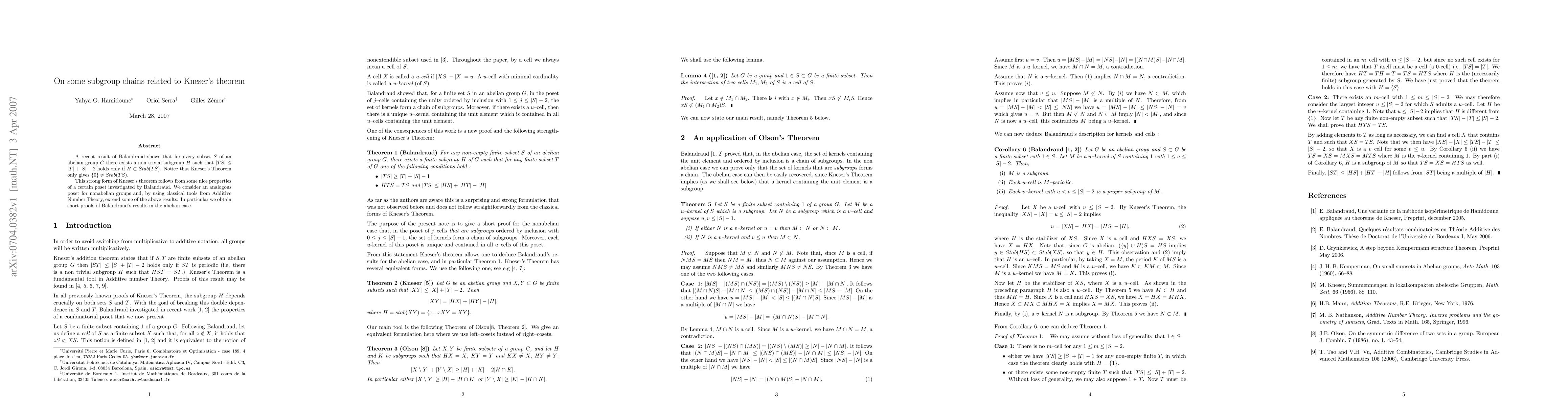 A recent result of Balandraud shows that for every subset S of an abelian group G, there exists a non trivial subgroup H such that |TS| <= |T|+|S|-2 holds only if the stabilizer of TS contains H. Notice that Kneser's Theorem says only that the stabilizer of TS must be a non-zero subgroup. This strong form of Kneser's theorem follows from some nice properties of a certain poset investigated by Balandraud. We consider an analogous poset for nonabelian groups and, by using classical tools from Additive Number Theory, extend some of the above results. In particular we obtain short proofs of Balandraud's results in the abelian case.