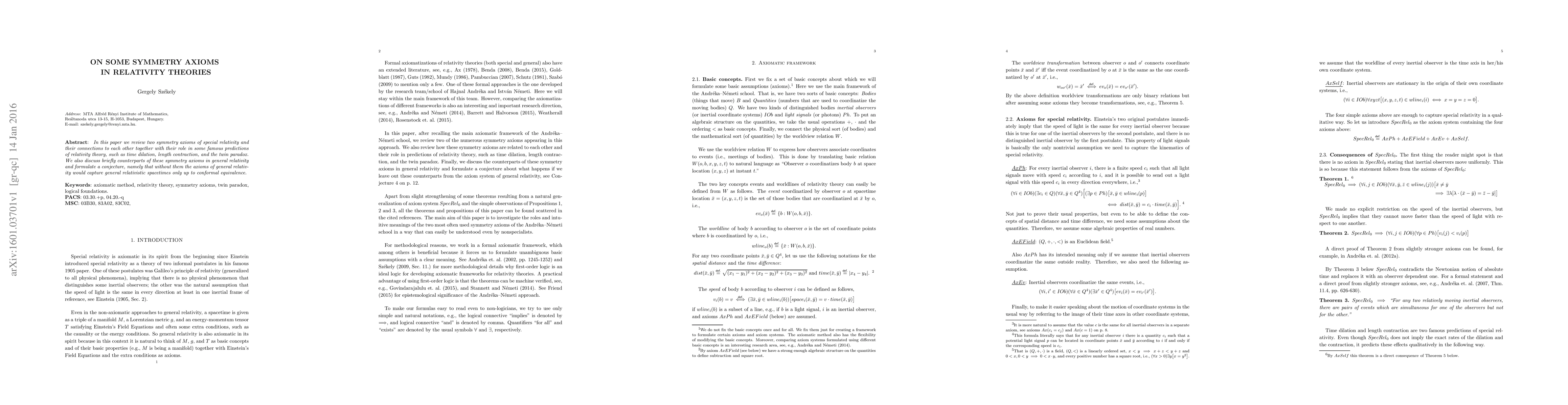 This paper reviews symmetry axioms in special relativity, exploring their connections to famous predictions like time dilation and the twin paradox. It also discusses their counterparts in general relativity and formulates a conjecture about the role of these axioms in describing spacetimes.
