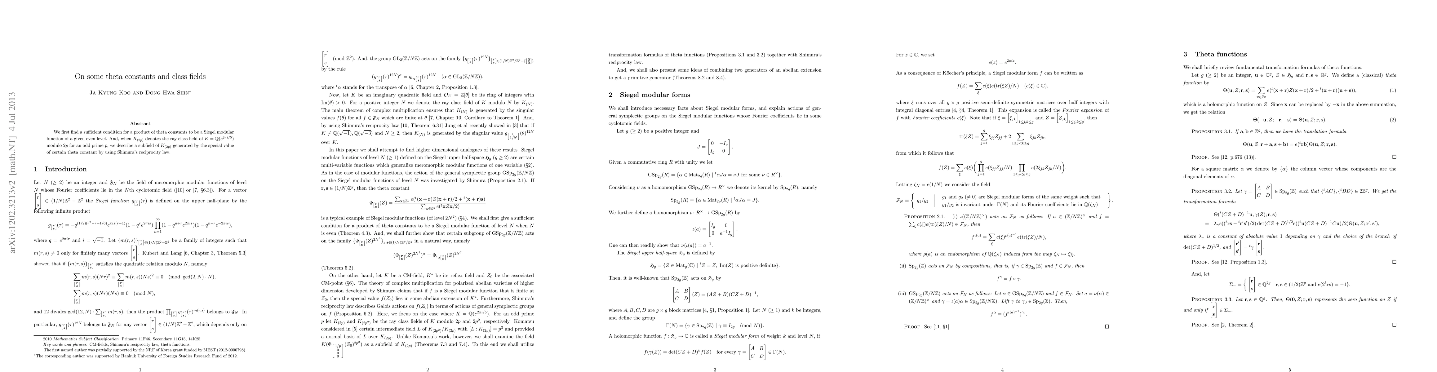 Researchers find conditions for theta constants to represent Siegel modular functions and apply Shimura's reciprocity law to describe subfields of ray class fields.
