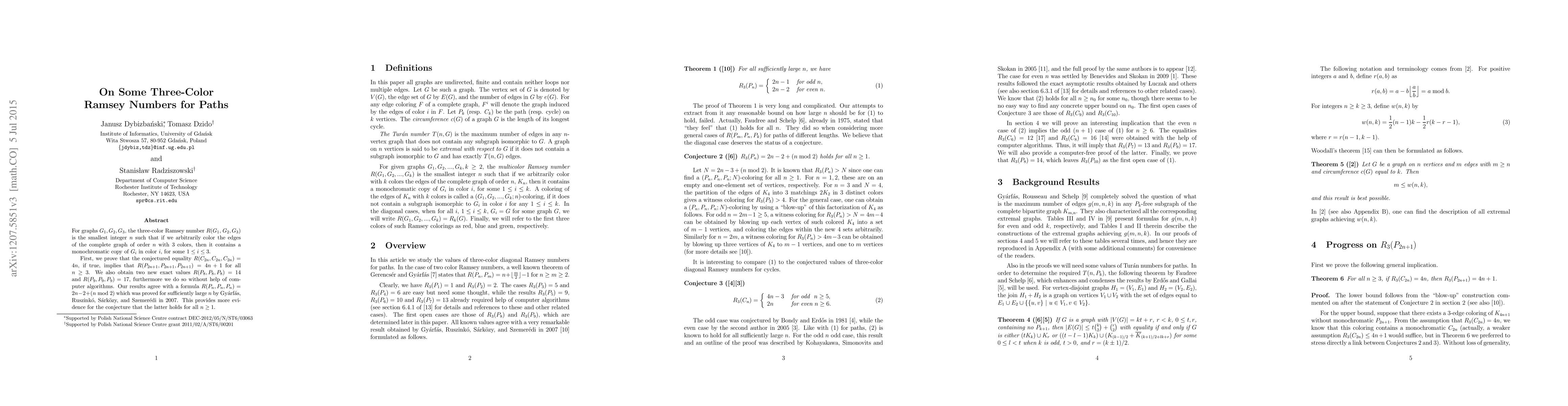 This paper investigates three-color Ramsey numbers for paths, proving that if $R_3(C_{2n},C_{2n},C_{2n})=4n$ holds, then $R_3(P_{2n+1},P_{2n+1},P_{2n+1})=4n+1$ for all $n \ge 3$. It also determines exact values for $R(P_8,P_8,P_8)=14$ and $R(P_9,P_9,P_9)=17$ without computational aid, supporting a conjectured formula for $R(P_n,P_n,P_n)$.