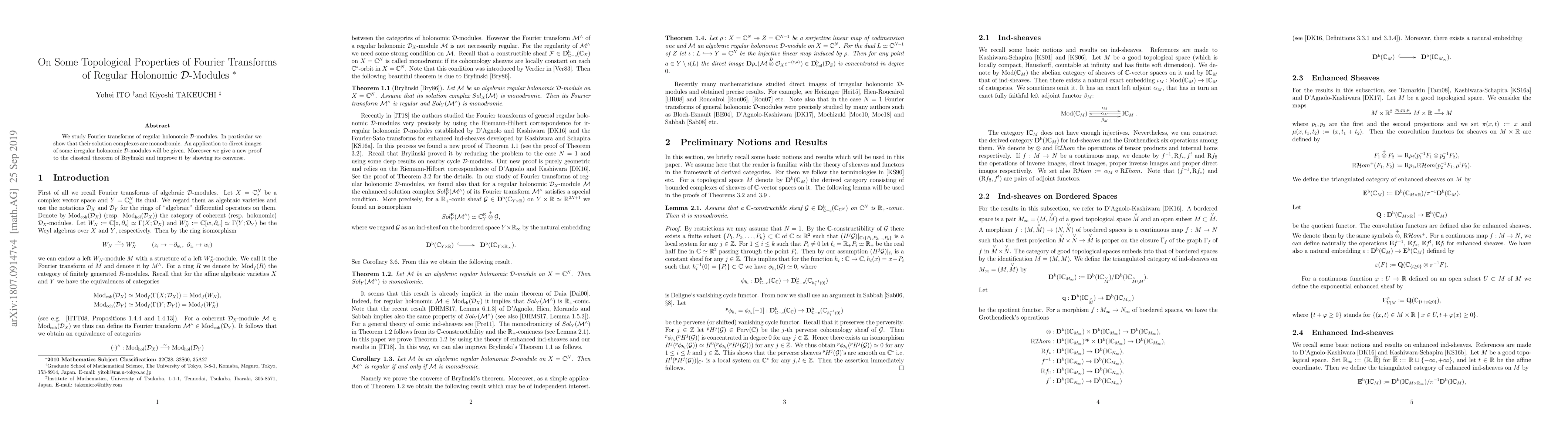 This paper investigates Fourier transforms of regular holonomic D-modules, demonstrating that their solution complexes exhibit monodromic behavior. It also provides a new proof and converse improvement to the classical theorem of Brylinski, with applications to direct images of irregular holonomic D-modules.