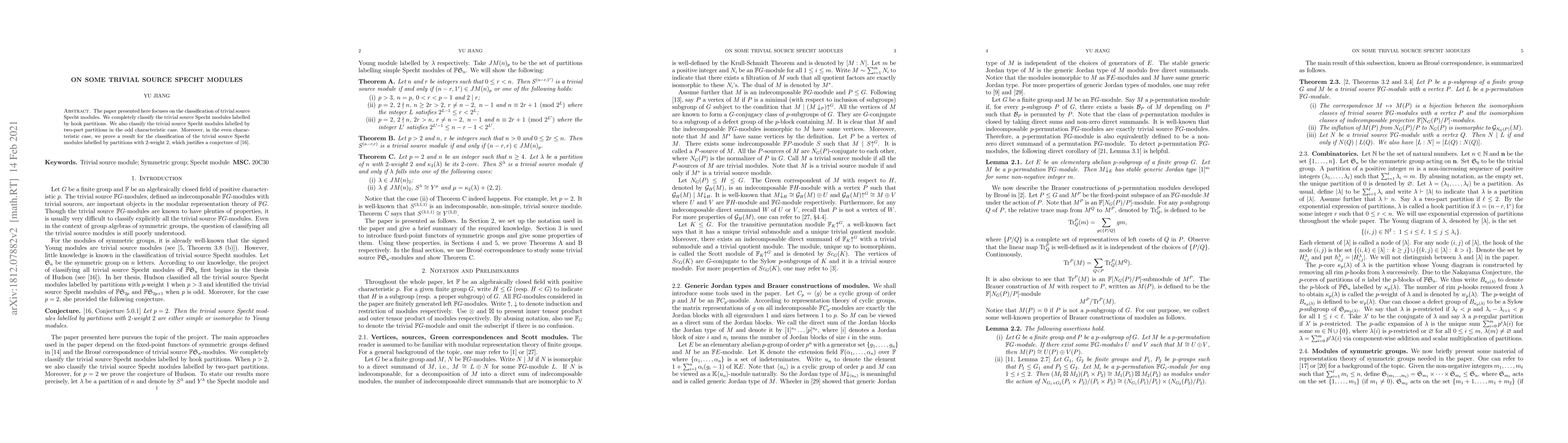 The paper presented here focuses on the classification of trivial source Specht modules. We completely classify the trivial source Specht modules labelled by hook partitions. We also classify the trivial source Specht modules labelled by two-part partitions in the odd characteristic case. Moreover, in the even characteristic case, we prove a result for the classification of the trivial source Specht modules labelled by partitions with 2-weight 2, which justifies a conjecture of [16].