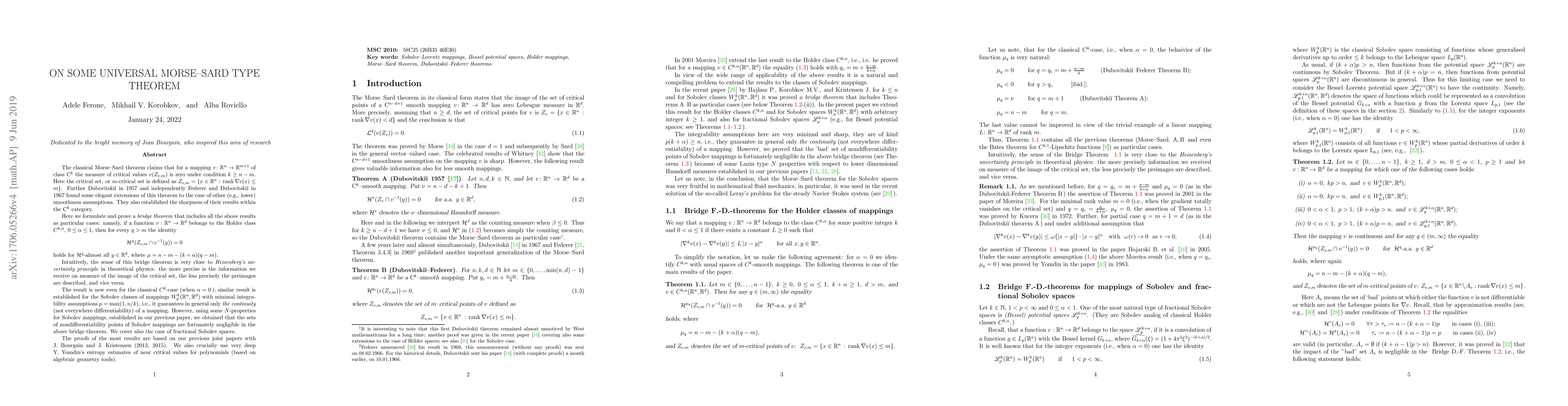 The paper presents a universal bridge theorem that unifies previous Morse-Sard extensions for various smoothness classes, providing a comprehensive result for both Holder and Sobolev mappings.