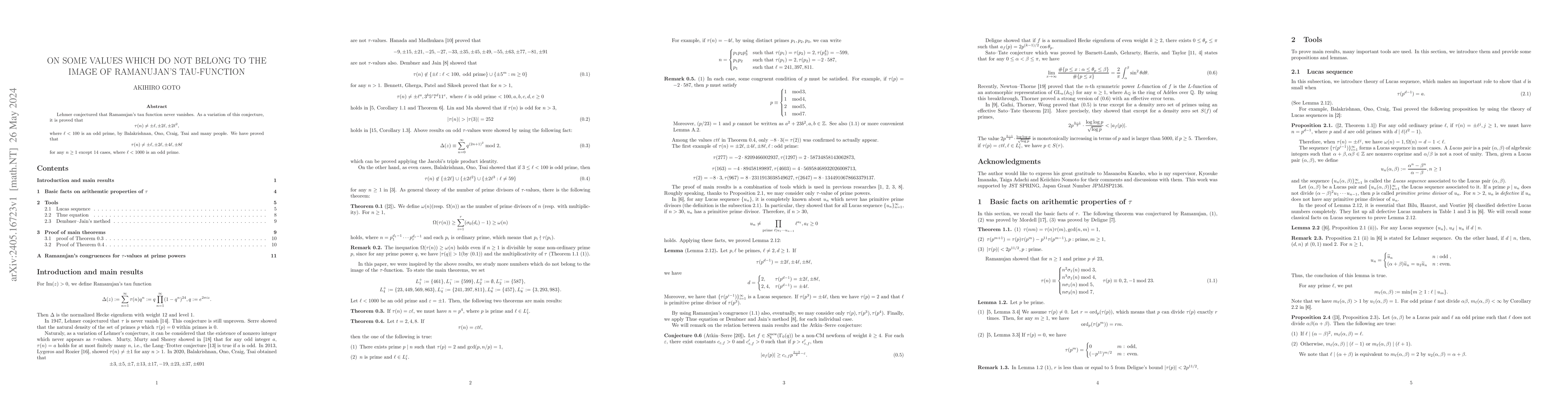 This paper proves that Ramanujan's tau function does not take certain specific negative and positive values of the form $\pm \ell, \pm 2\ell, \pm 4\ell, \pm 8\ell$ for odd primes $\ell$ less than 1000, except for 14 specific cases. This extends previous results that limited the values to $\pm \ell$ and $\pm 2\ell$.